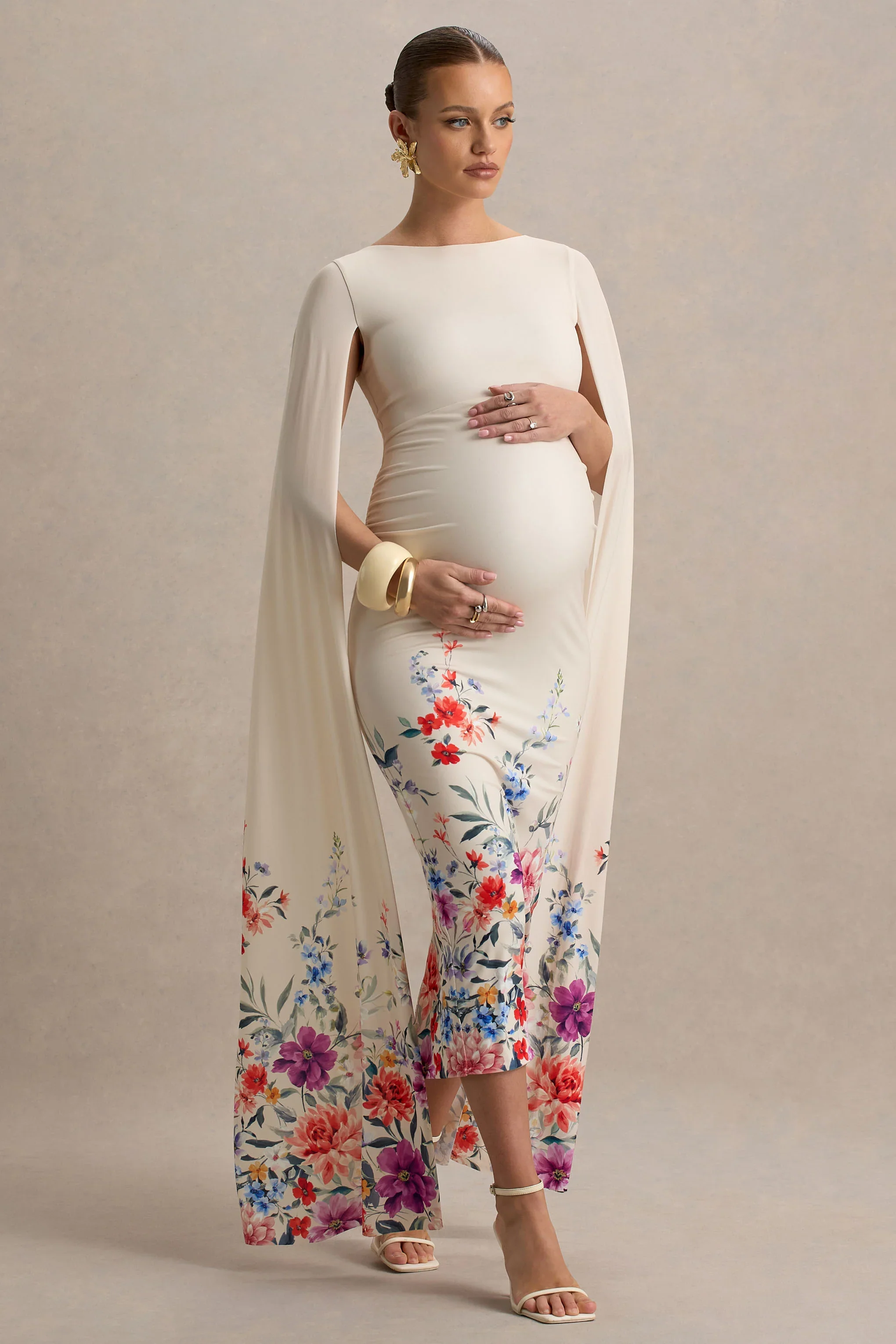Providence | Light Pink Floral Print Boat-Neck Maternity Midi Dress With Cape Sleeves
