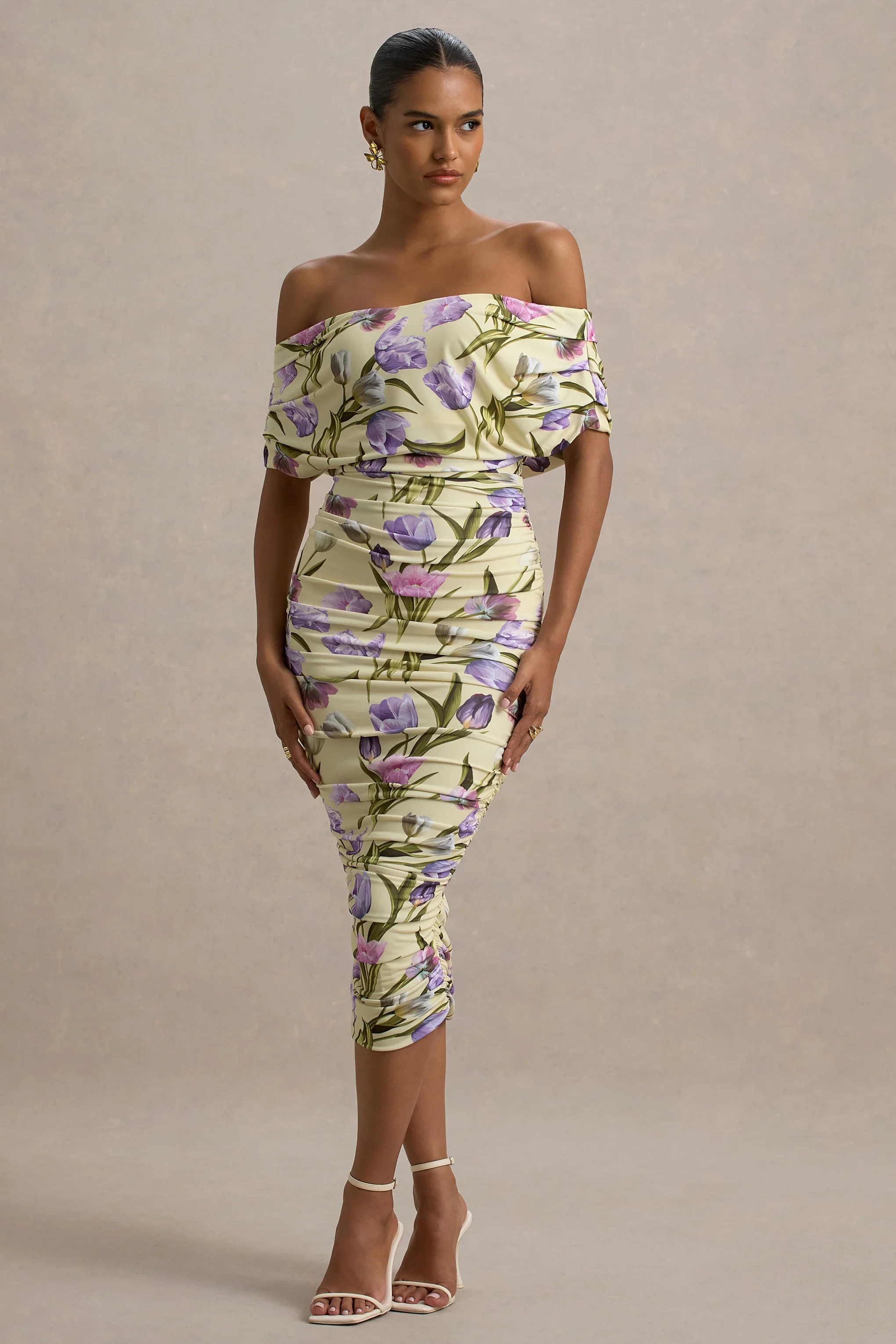 Rayleigh | Tulip Floral Print Bardot Ruched Midi Dress