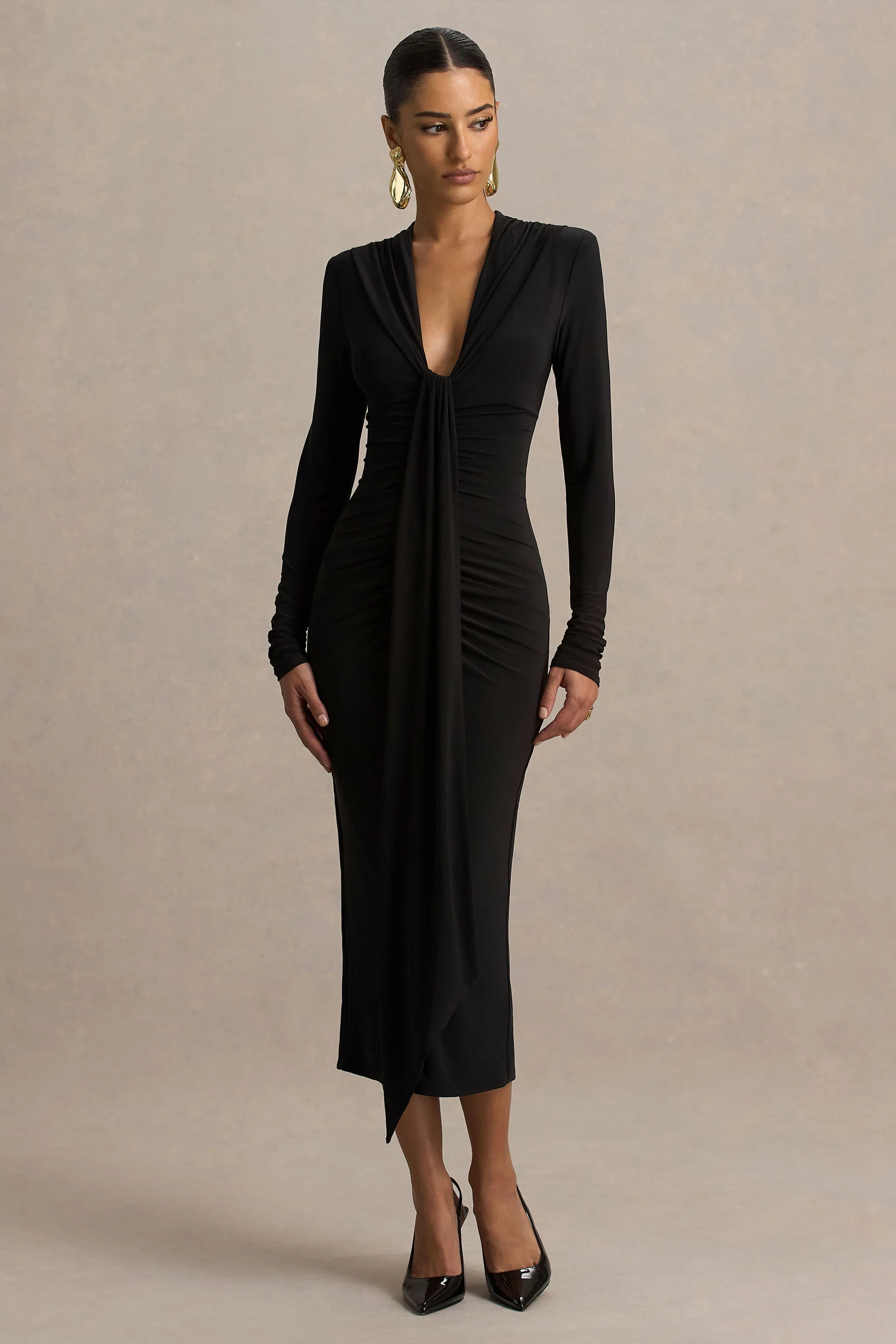 Ivara | Black Plunge-Neck Midi Dress With Ruched Detailing And Sash