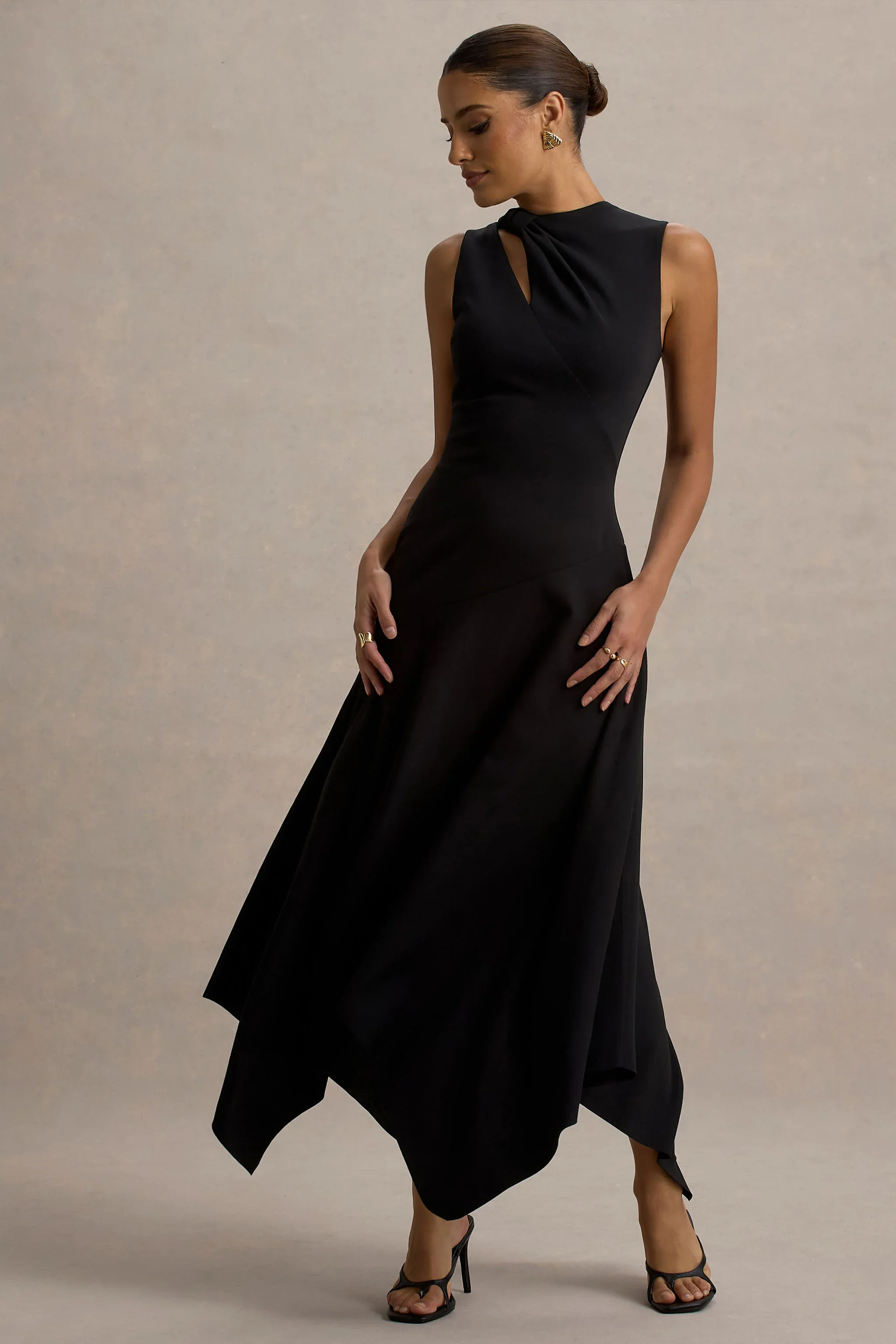 Francesca | Black Knotted Midi Dress With Handkerchief Hem