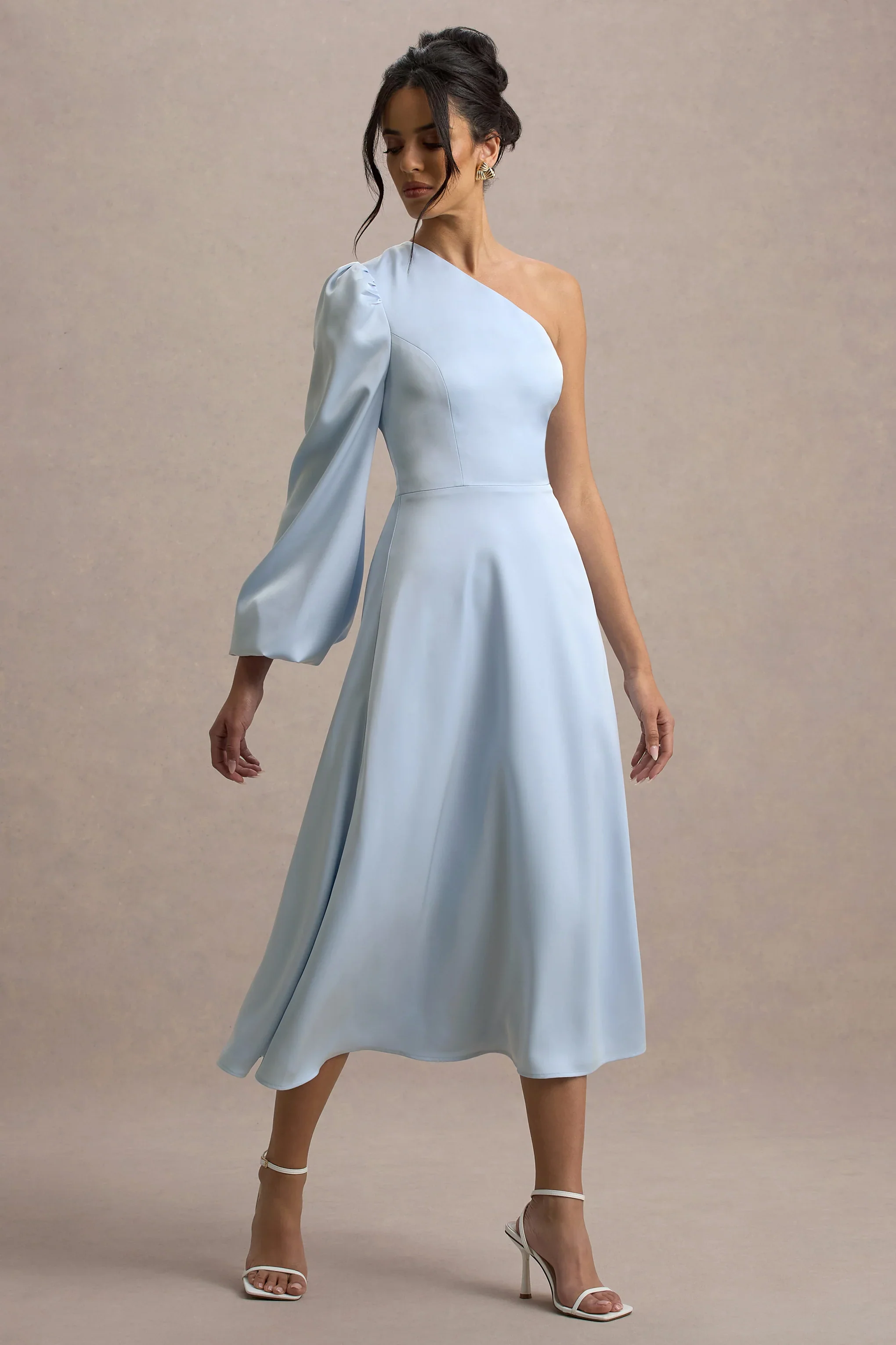 Haila | Powder Blue Satin One-Shoulder Midi Dress