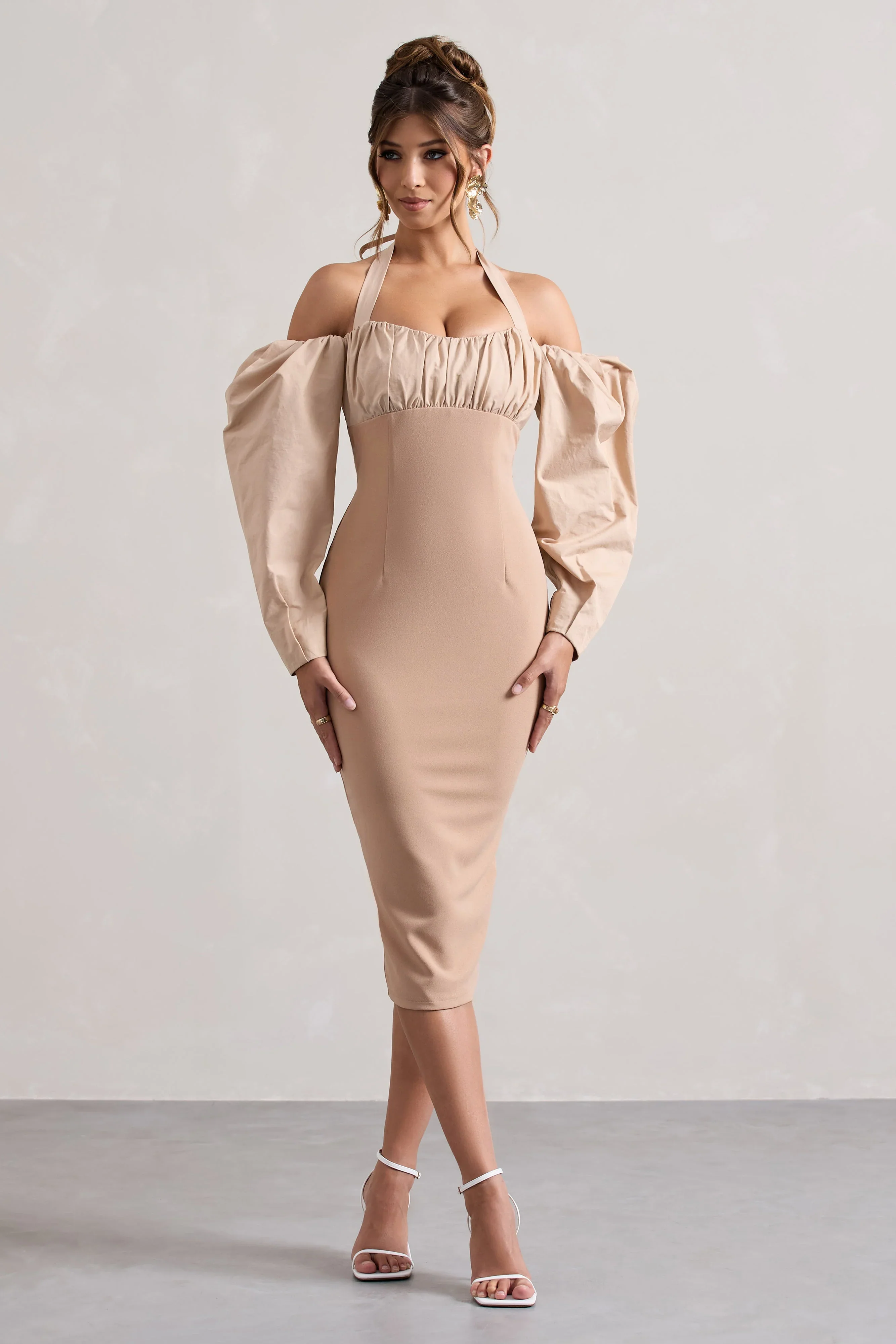 Couture Client | Champagne Halter-Neck Puff Sleeve Midi Dress
