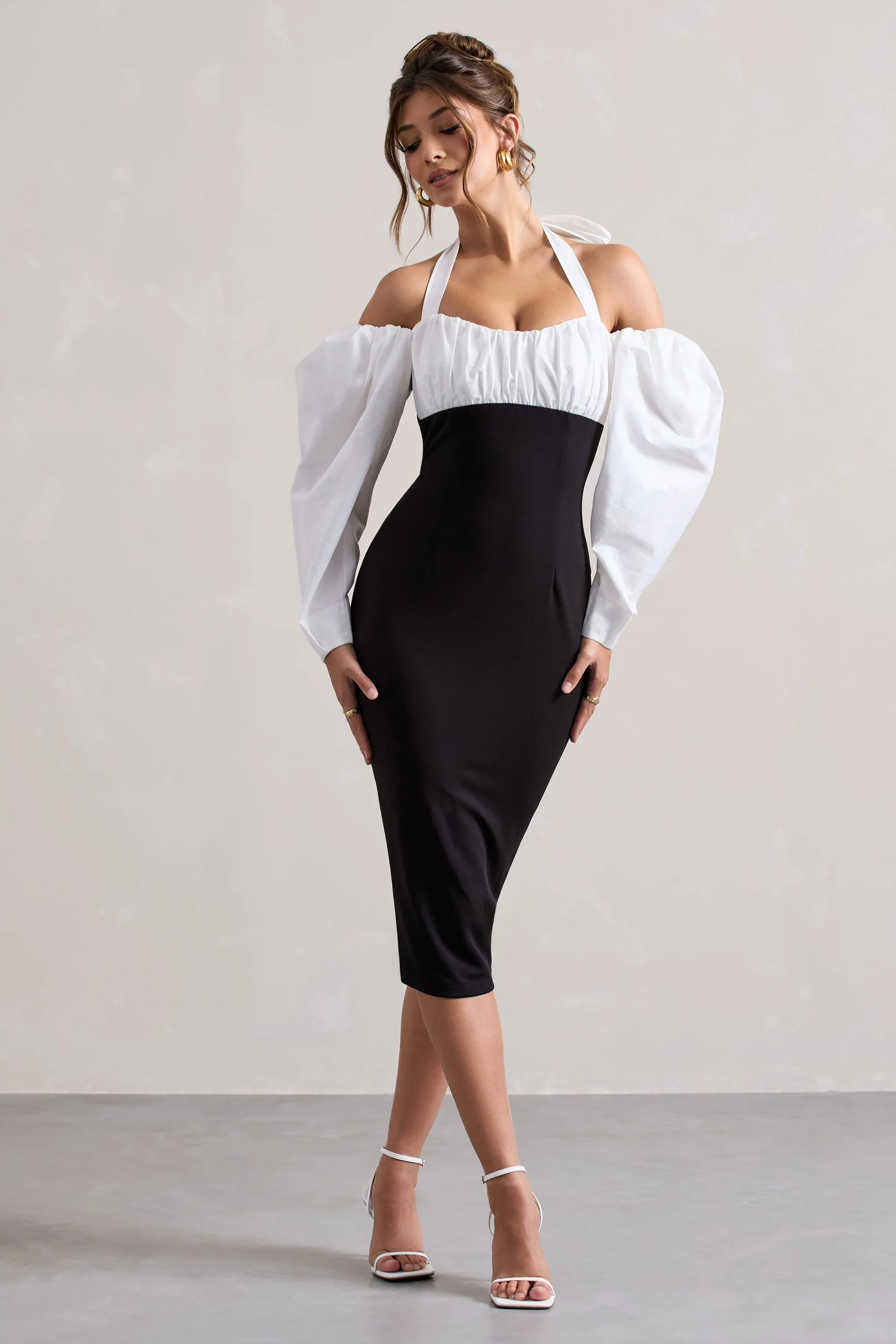 Couture Client | Black & White Polka Dot Halter-Neck Puff Sleeve Midi Dress