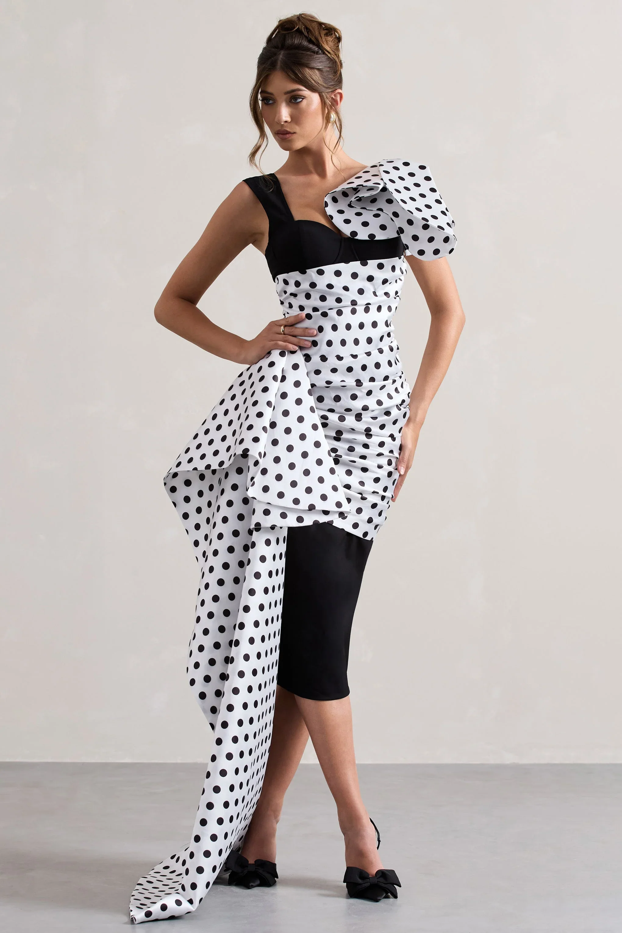 Unattainable | Black Polka Dot Wrap Midi Dress Volume Drape
