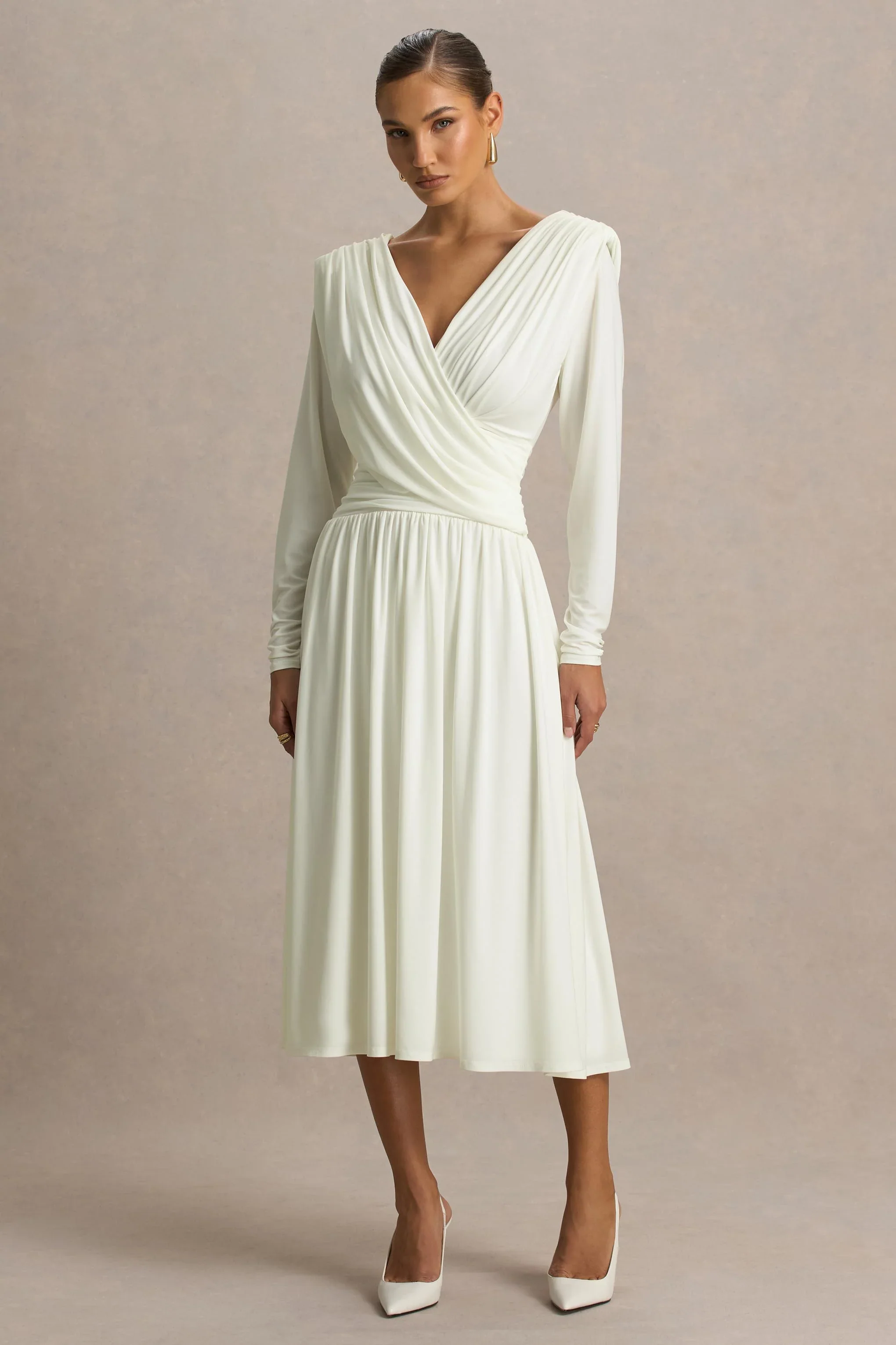 Alexis | Cream Plunge-Neck Midi Dress With Draped And Ruched Detailing