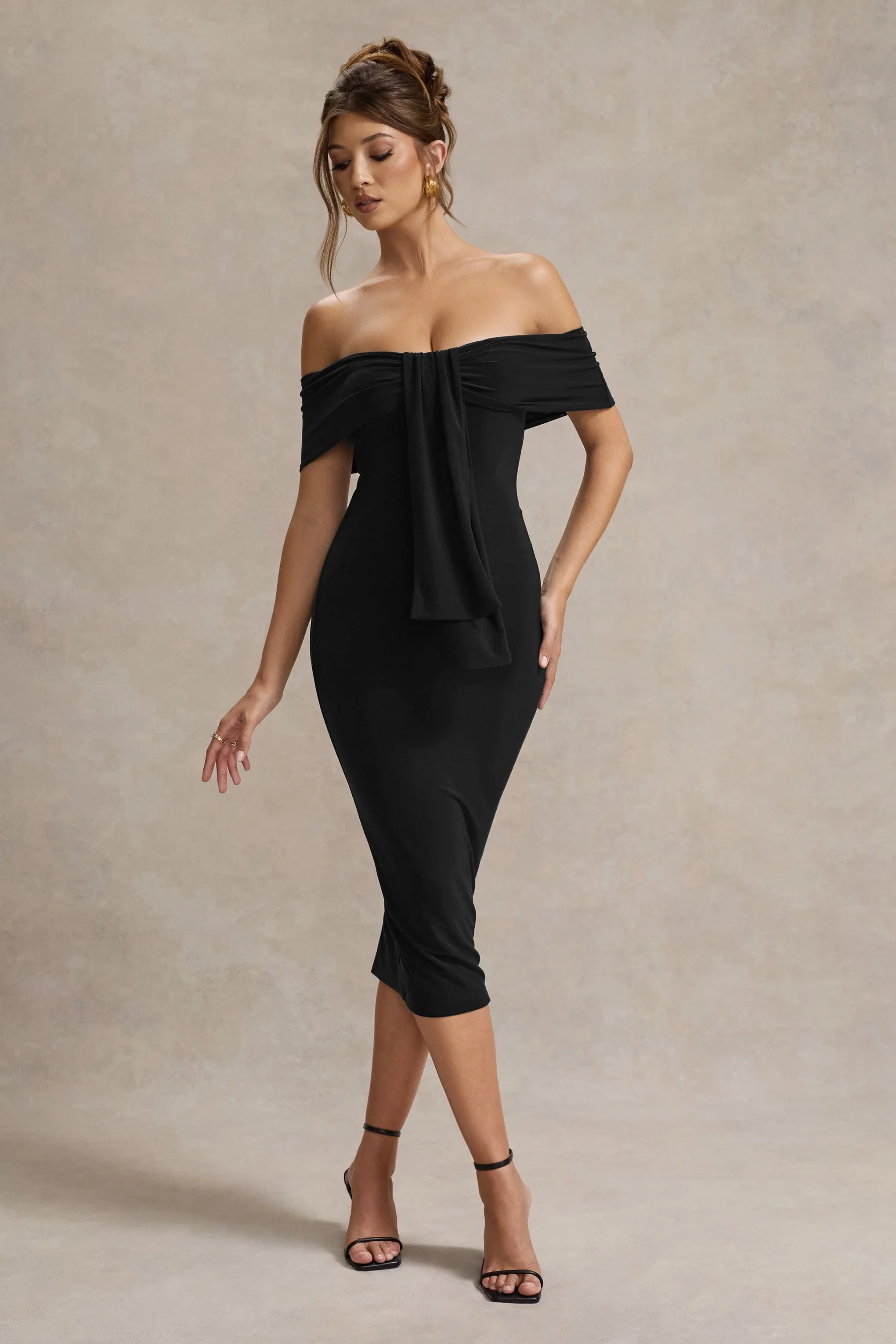 Selbie | Black Bardot Midi Dress With Drape
