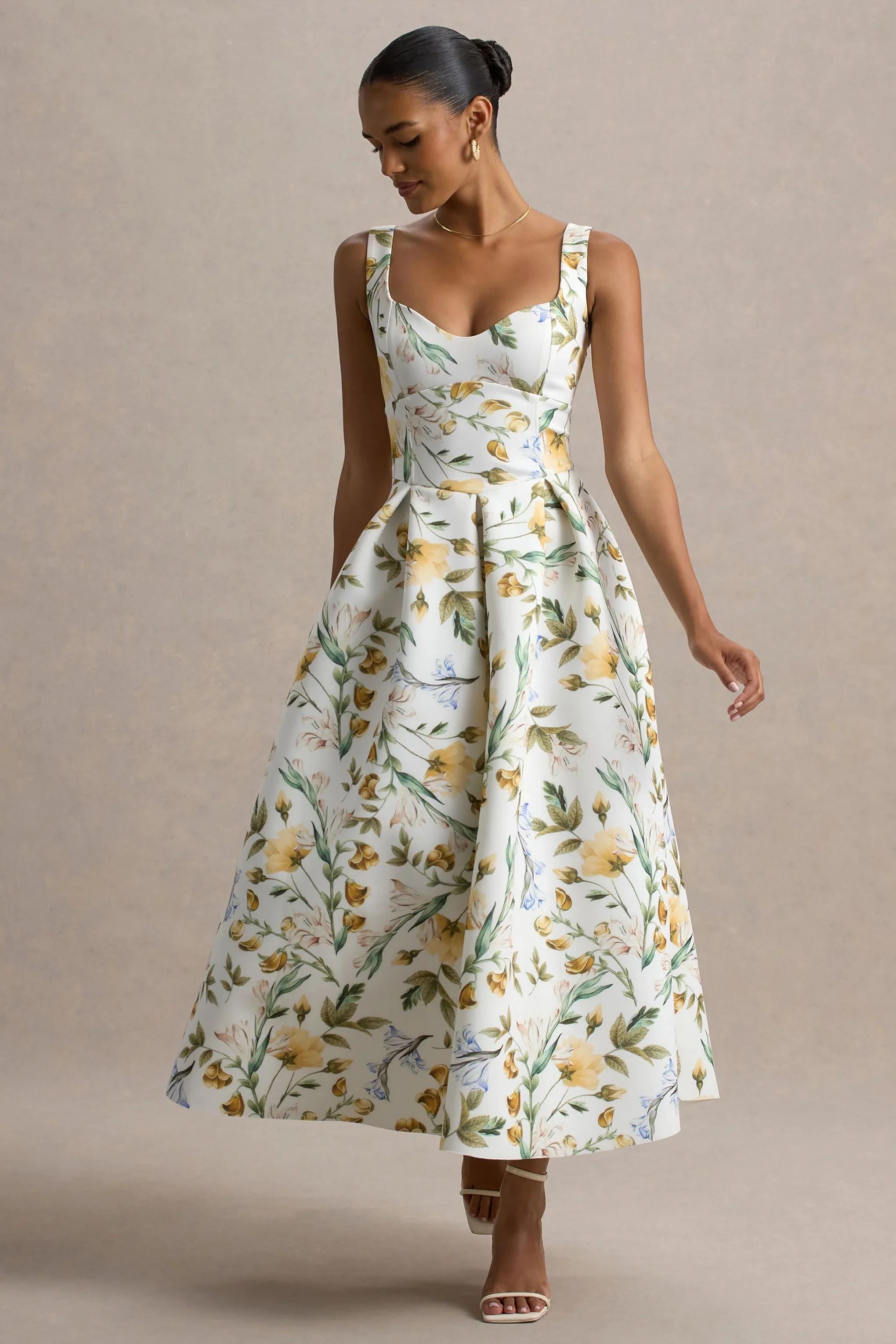 Rosemary | Floral Print Sweetheart Midi Dress With Drop Waist