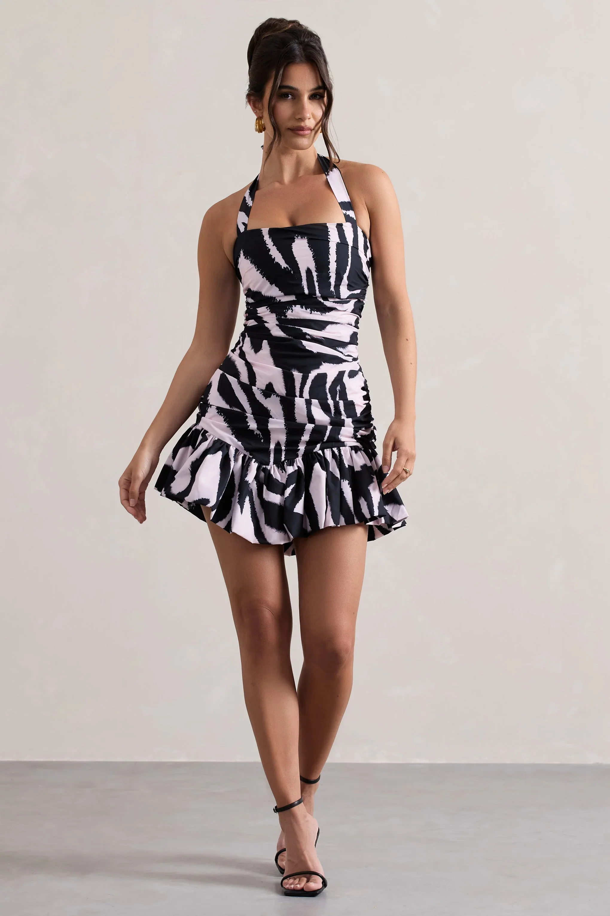 Zahra | Zebra Print Halter-Neck Ruched Mini Dress With Ruffle Hem