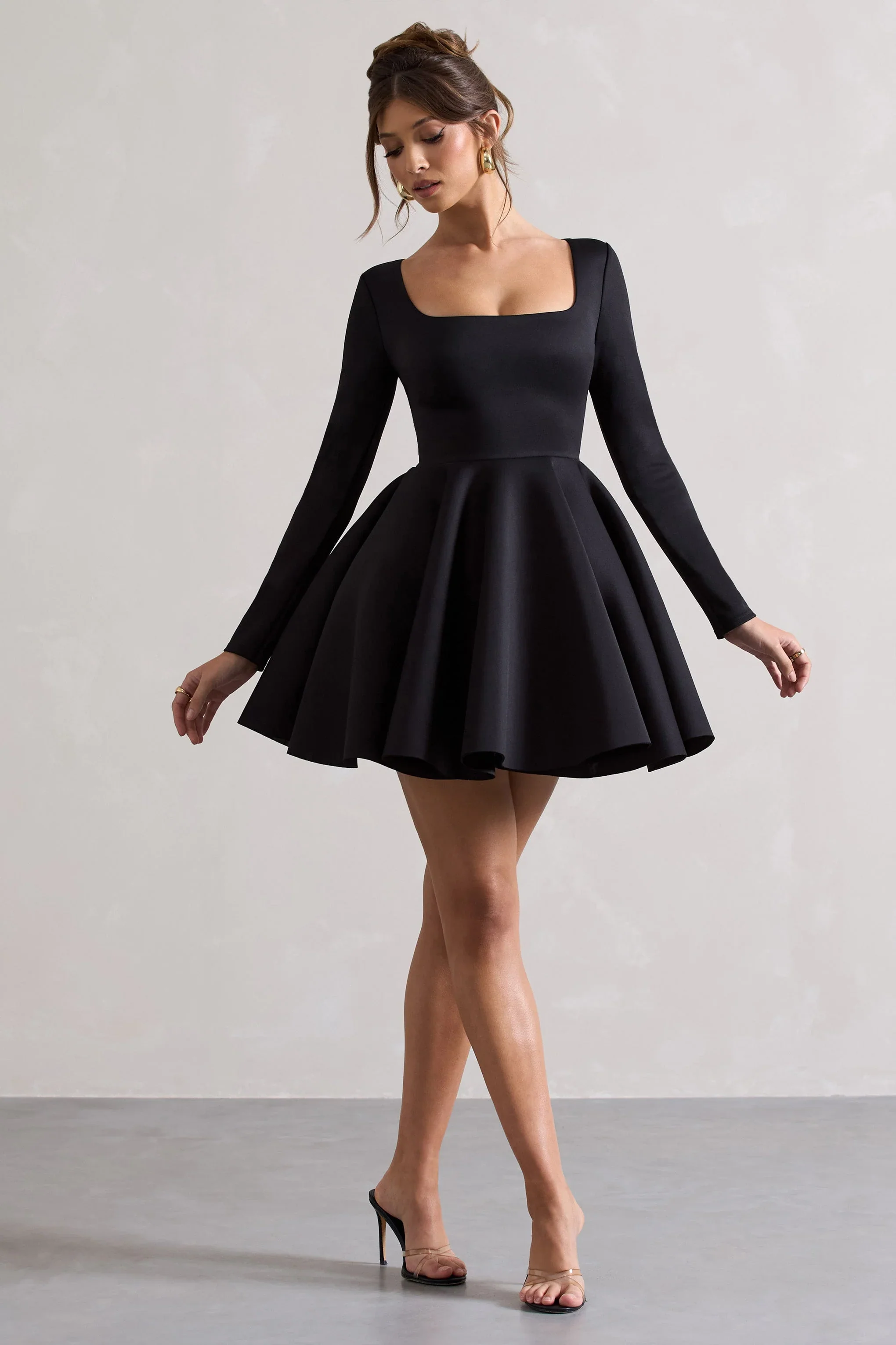 Wilder | Black Square-Neck Long-Sleeve Skater Mini Dress