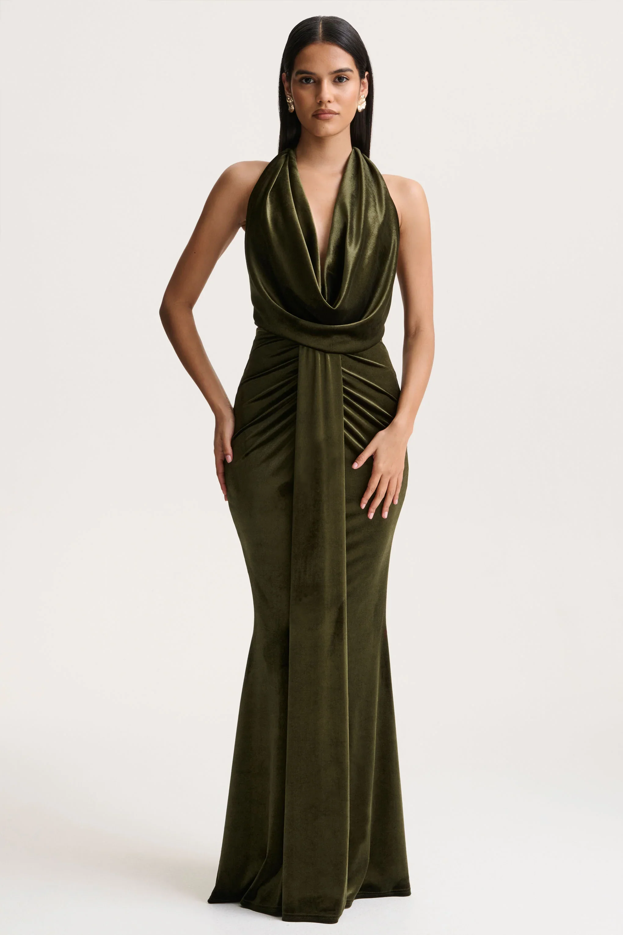 Lavernia | Olive Velvet Halter-Neck Maxi Dress With Gathered-Detailing