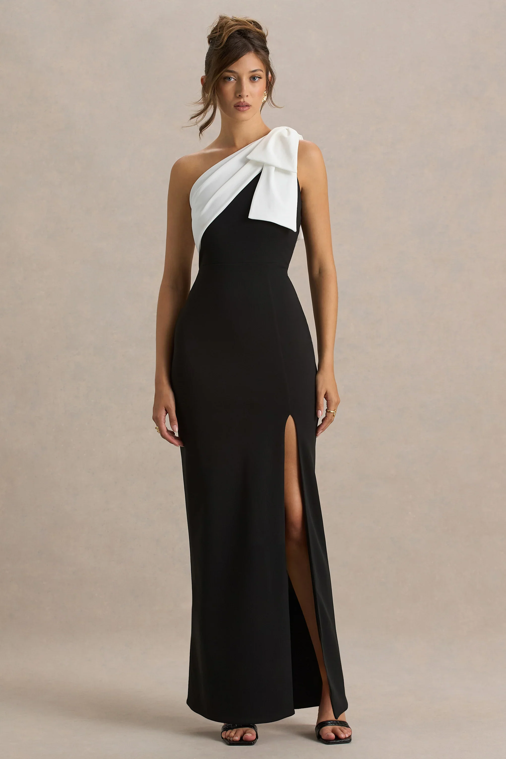 Kiri | Black & White One-Shoulder Bow Maxi Dress