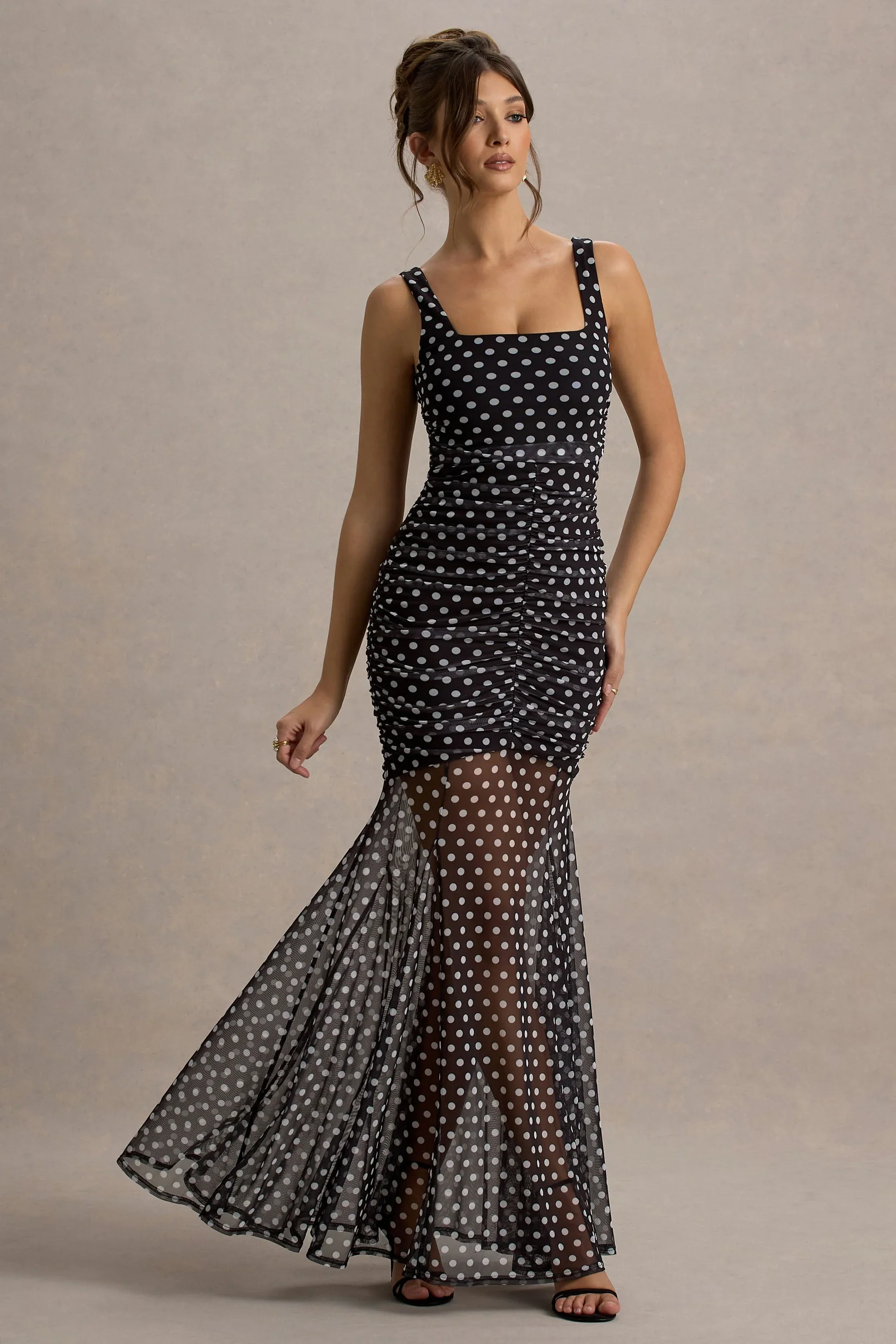 Galaxia | Black & White Polka Dot Maxi Dress With Mesh Skirt