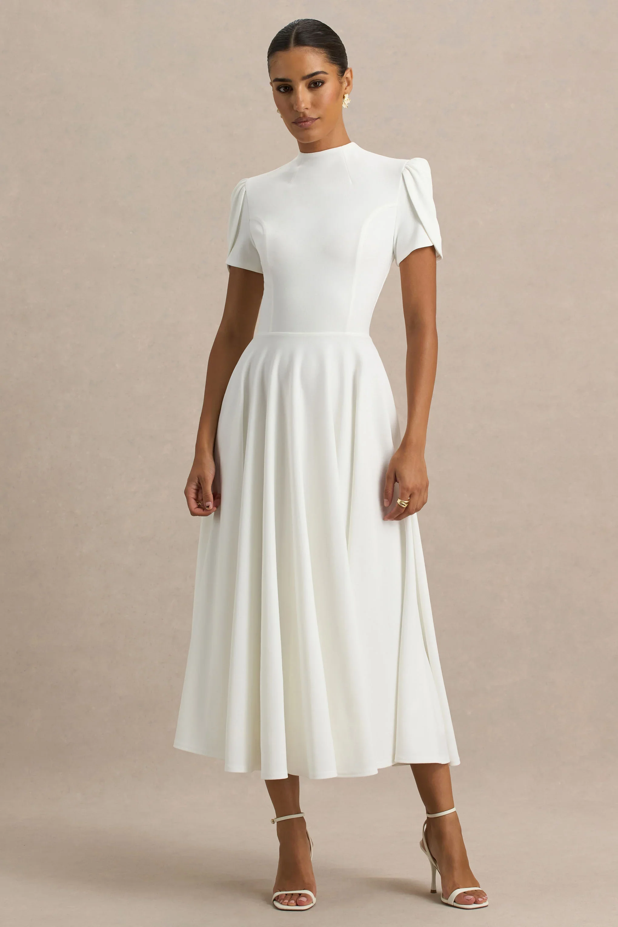 Vicky | White High Neck Midi Dress With Puff Sleeves