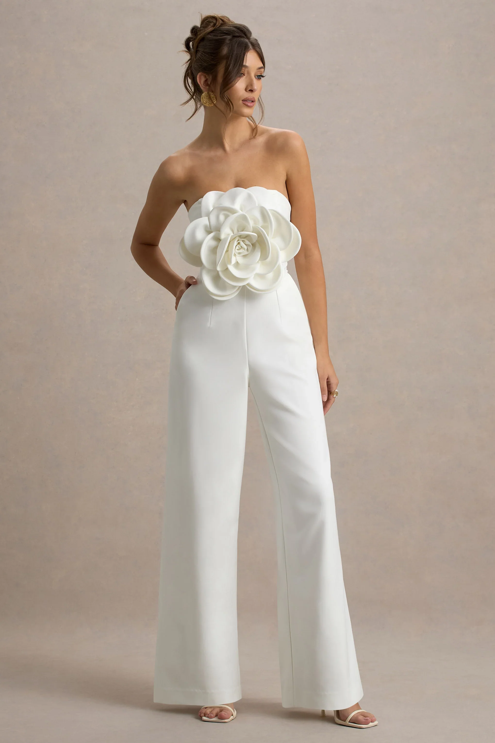 Opia | White Bandeau Wide-Leg Jumpsuit With Large Floral Corsage