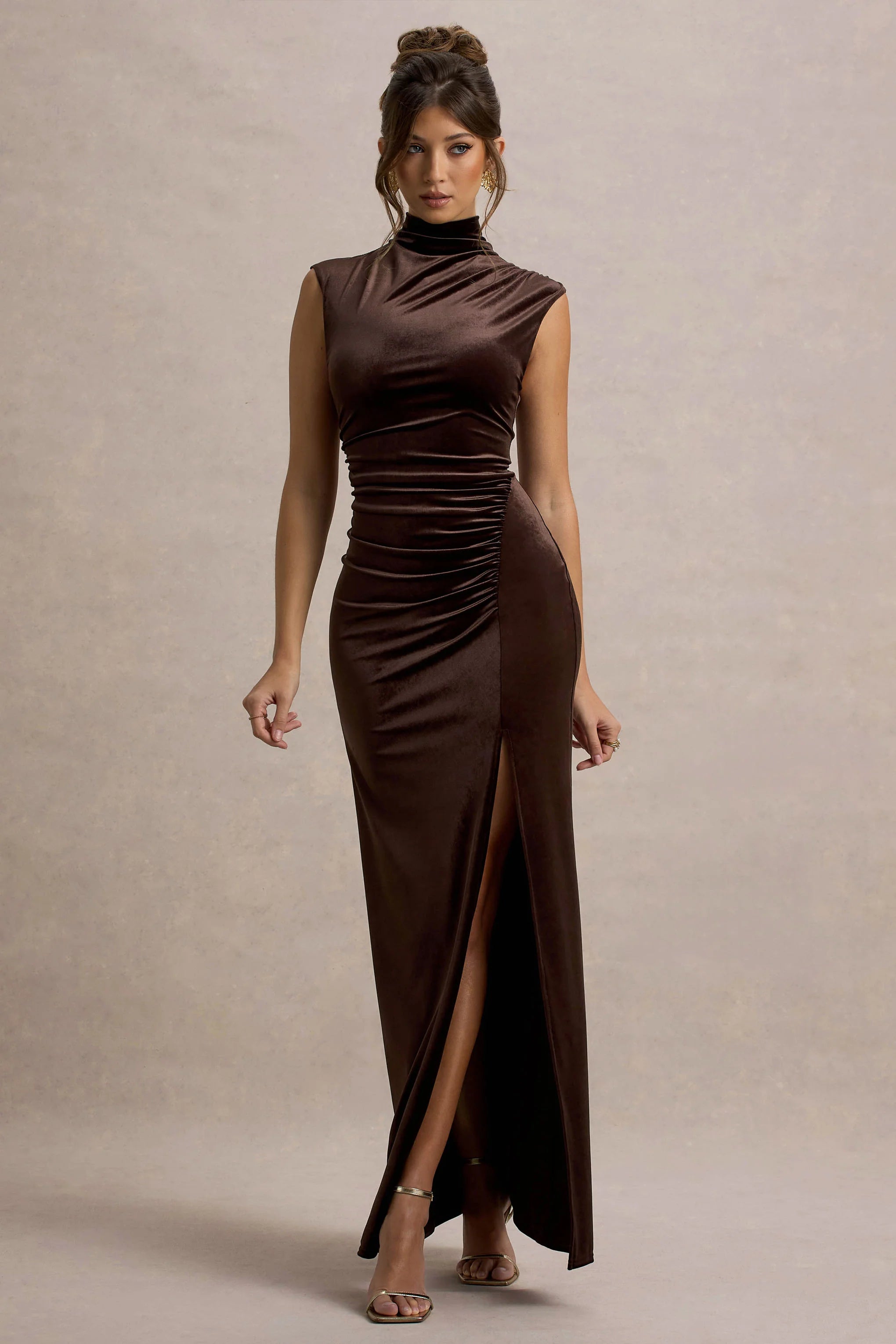 Defined by its luxurious fabric and striking silhouette, Abilene is a showstopping choice for your most glamorous occasions. Made from our premium chocolate velvet, this high-neck maxi dress features a daring thigh-high split, effortlessly blending elegance with allure. The sumptuous velvet clings to your curves, while the sleek high neck adds a touch of sophistication. Keep Abilene at the forefront of your look by pairing it with metallic heels and sparkling statement earrings. Finish with a sleek updo and a bold lip to turn heads at your next event.
