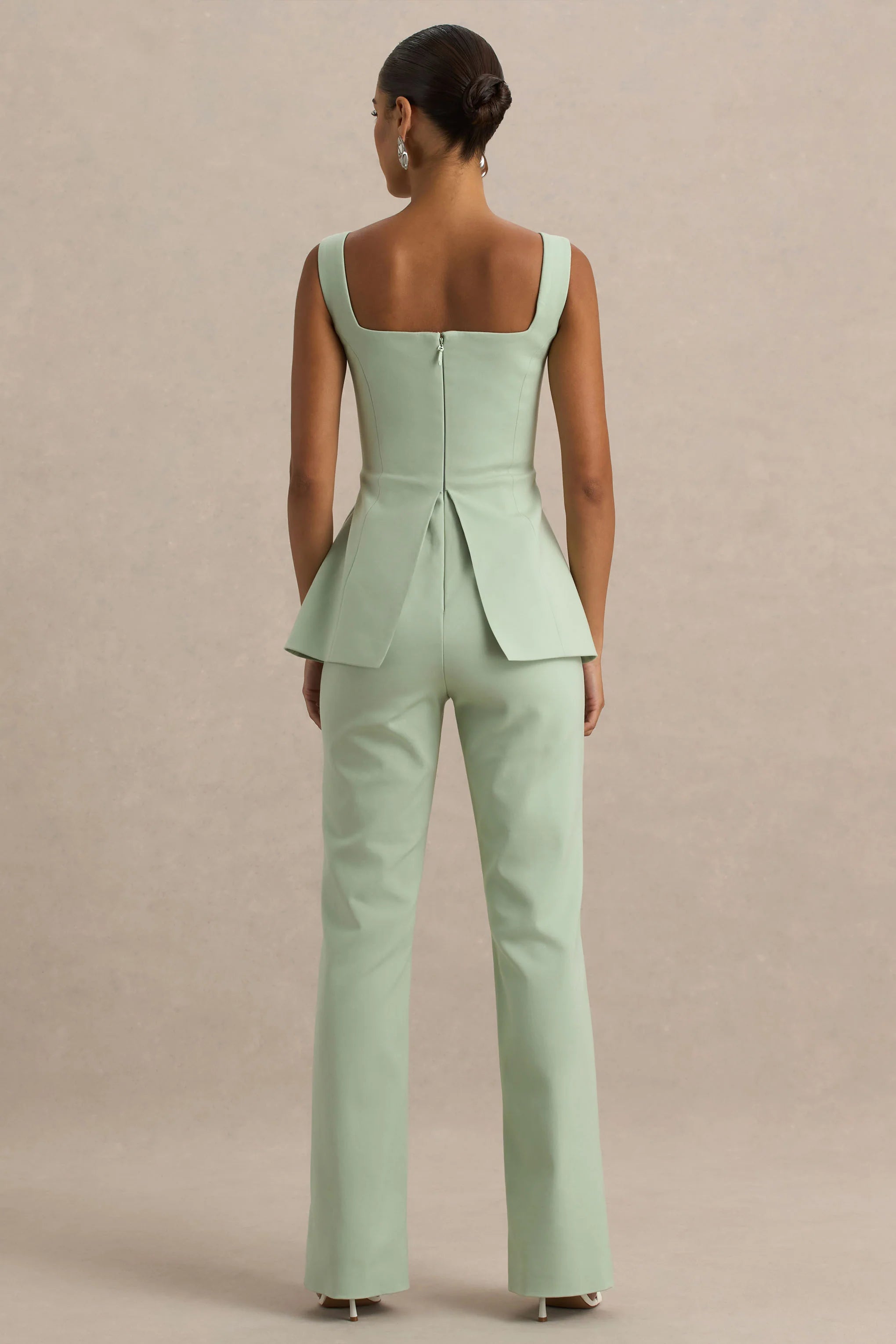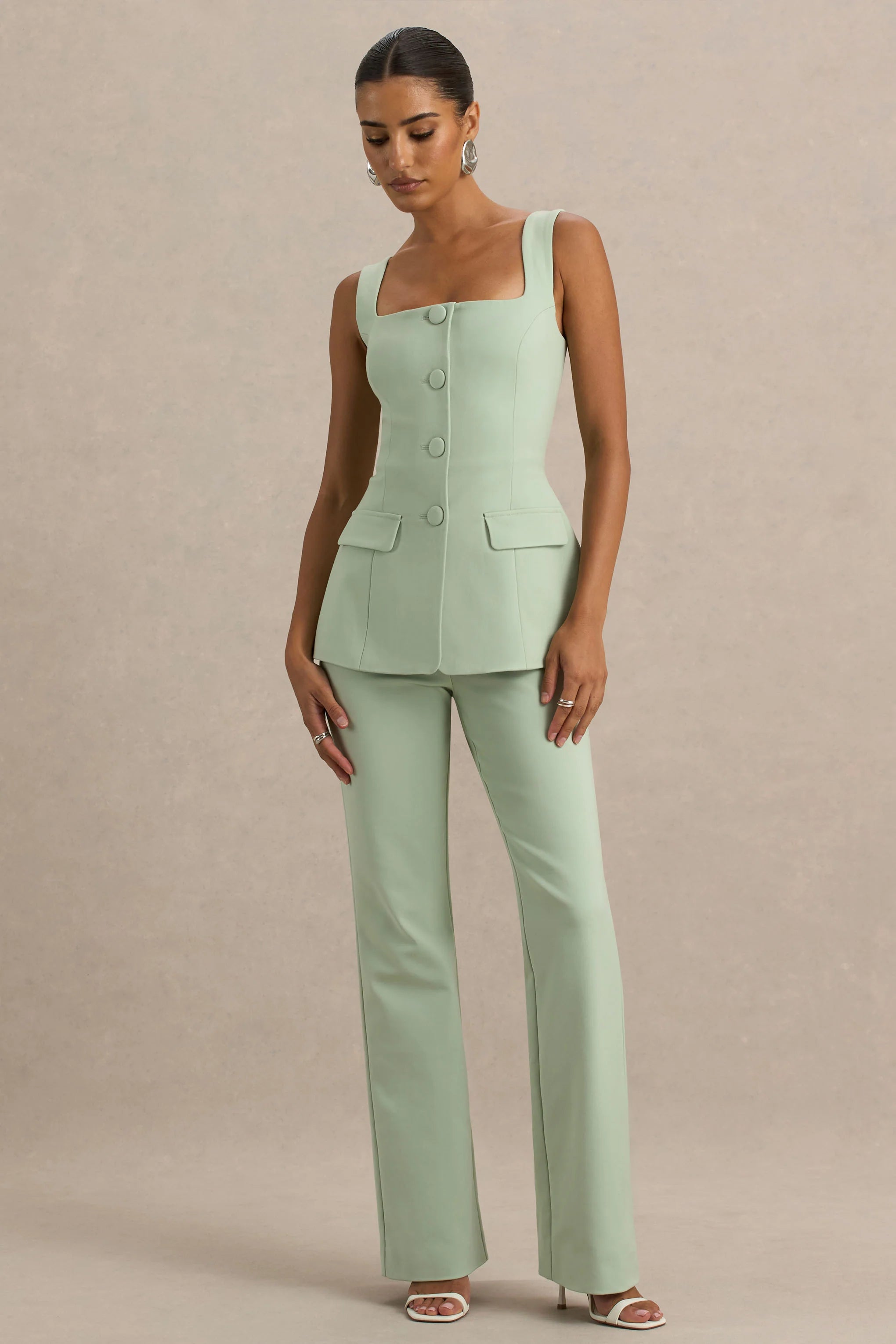 Embody a chic and understated vision in Aceline. Crafted in our premium cotton modal, in a delicate light green hue, this jumpsuit is the epitome of elegance. Designed with a framing square neckline and a bodice adorned with details, including self covered buttons and faux pockets, this piece is made for making an entrance. The flared trousers ensure a figure flattering finish that'll have you looking sleek from every angle. Whether its a ladies lunch, a day at the races or a romantic date night, in Aceline you will exude confidence and style.