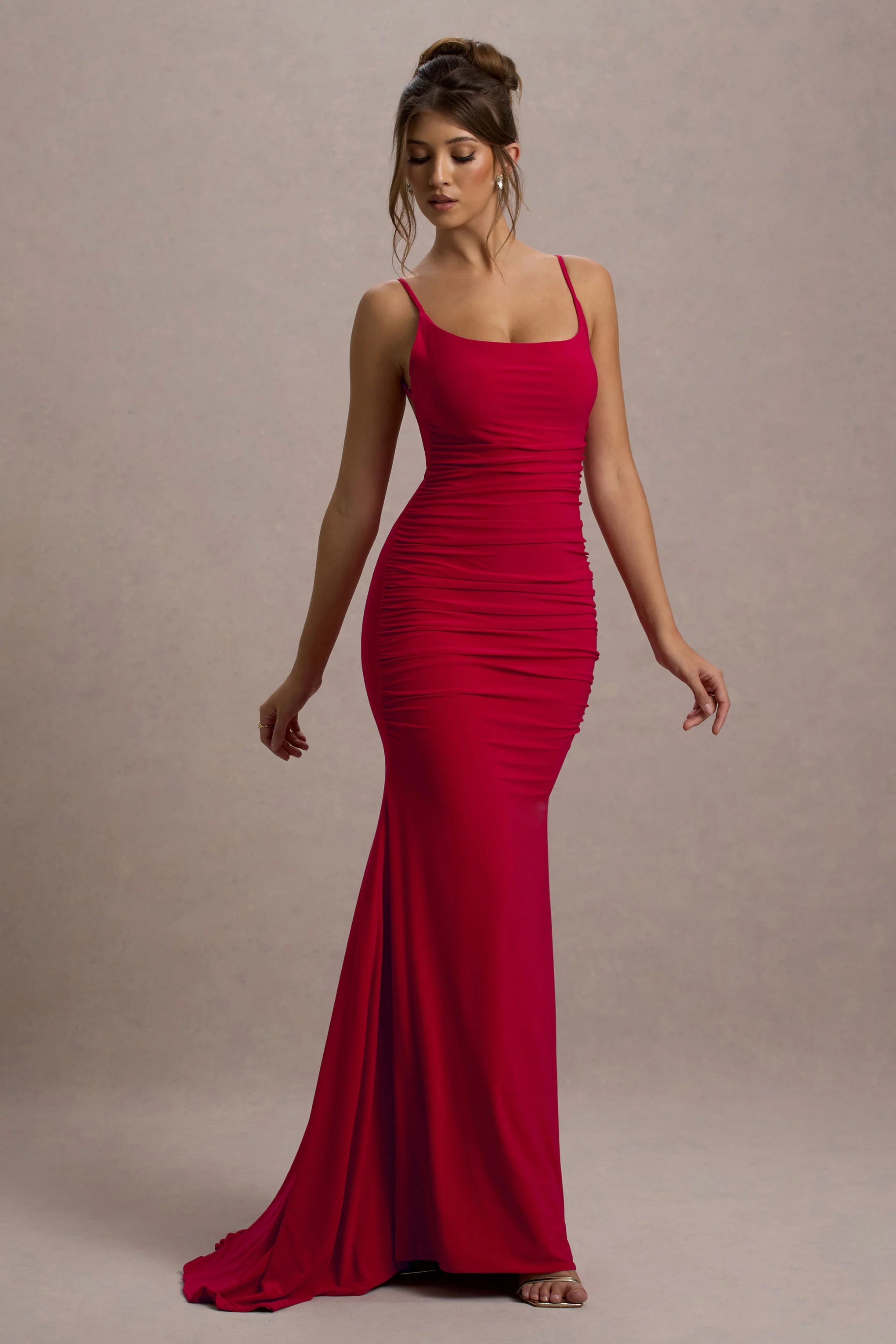 Who says the bride can solely bring the drama? Our latest maxi dress known as Adele is crafted from premium ruched jersey in a scarlet red hue. A plunging back is supported from delicate straps which can be adjusted for the perfect fit whilst a fishtail skirt showcases a godet train from behind.