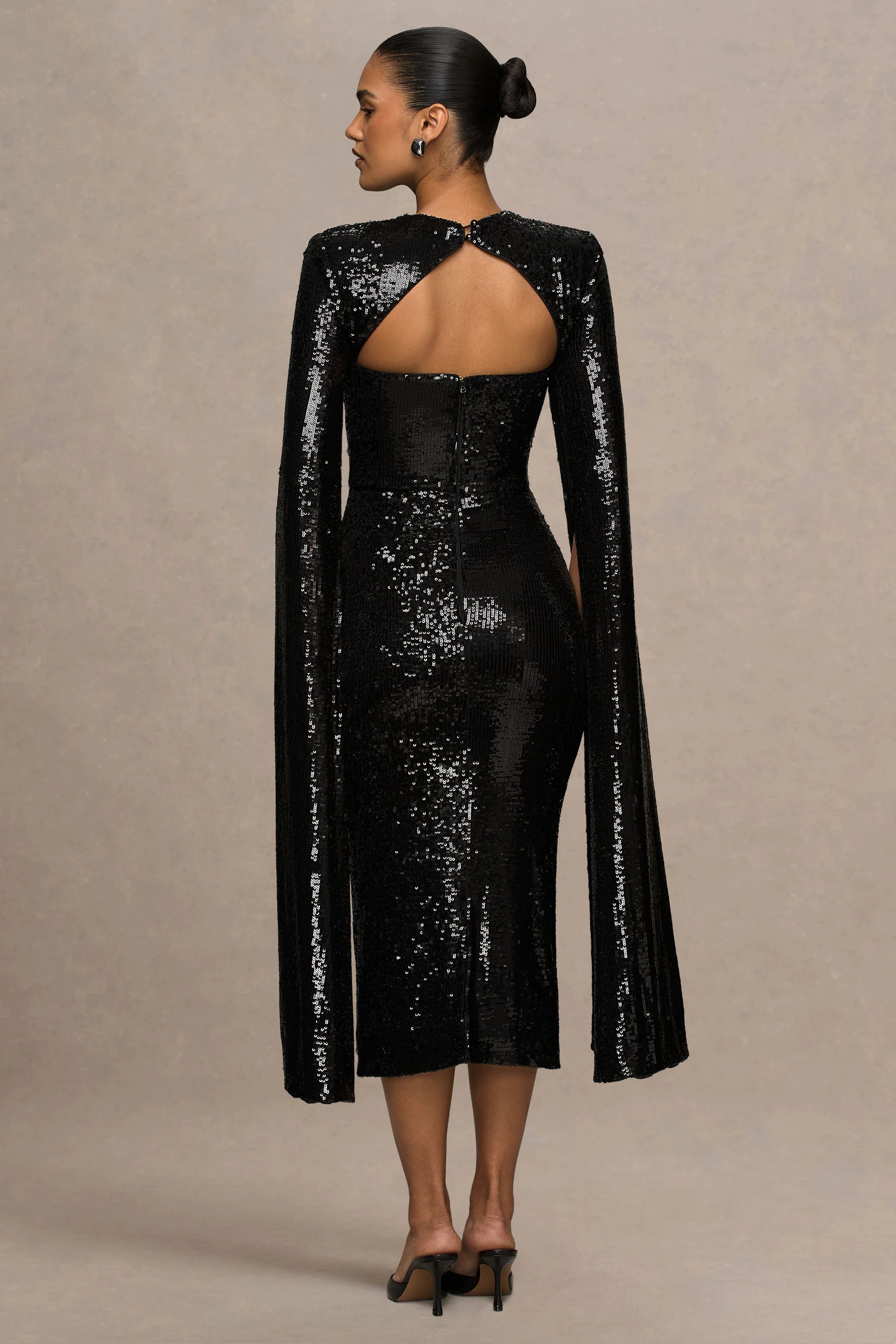 Say hello to Adeline, a dazzling midi made to command attention. Crafted from our premium black sequins, this statement style features a sleek crew neckline and a daring chest cut-out for a modern twist. Flowing cape sleeves add elegant movement, while the centre-back split ensures a sophisticated finish. Perfect for cocktail hours and special occasions, Adeline embodies effortless glamour with a contemporary edge.
