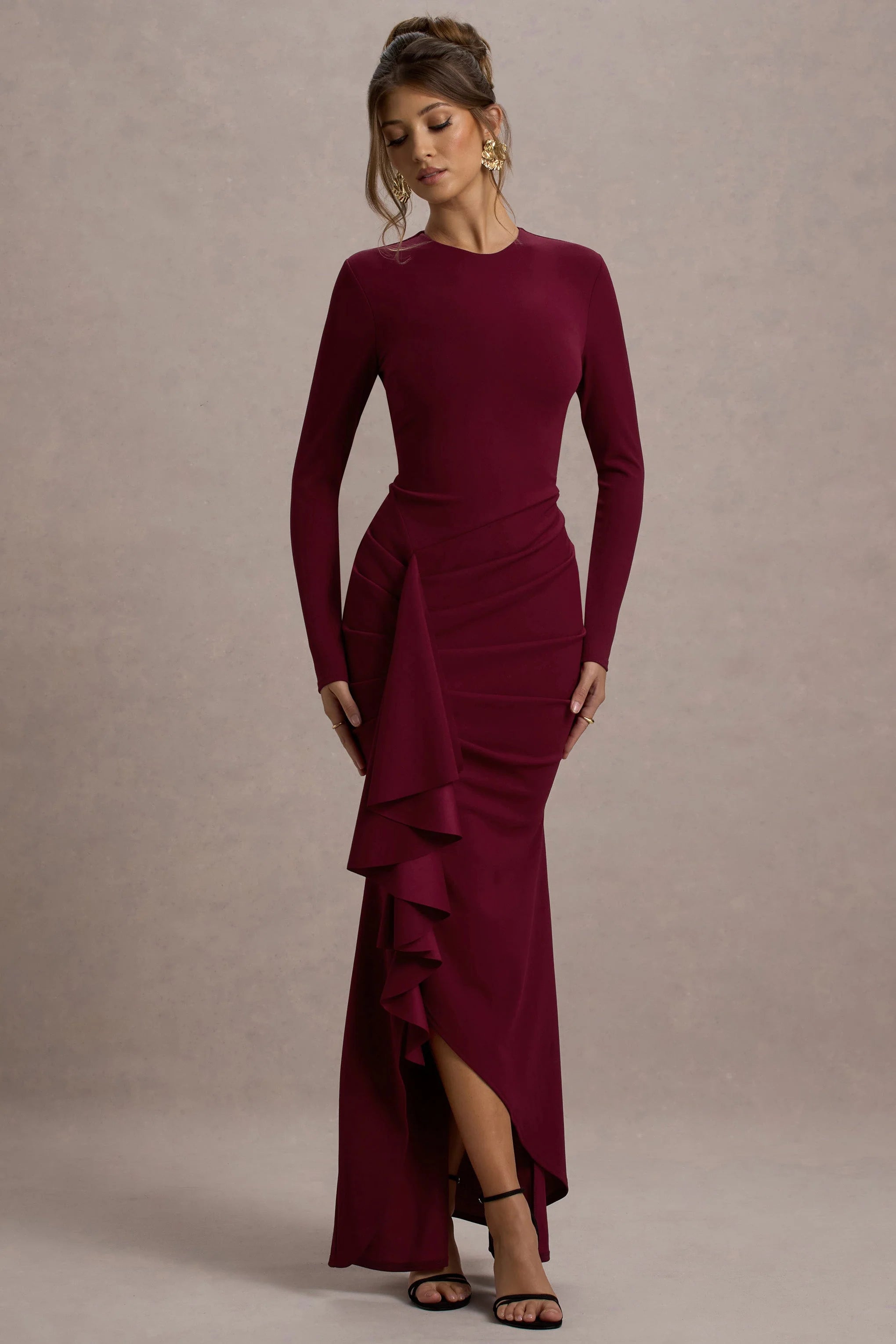 Defined by cascading ruffles, stand out at your next event in Alayna. With a fluid silhouette that sweeps to the floor and skims the body, this berry maxi dress boasts long sleeves and a gathered waist highlighted by an artful ruffle trim.