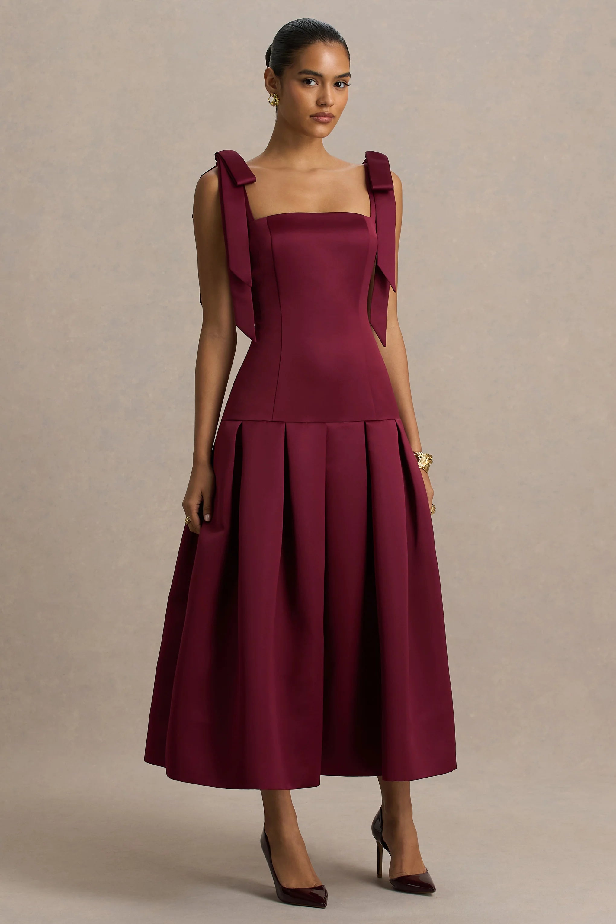 The perfect combination of class and elegance, our latest midi Alberta, has just landed. Crafted in our premium satin in a gorgeous burgundy shade, this piece features delicate bow straps and a gorgeous flowing silhouette. Ideal for wedding parties or graduations.