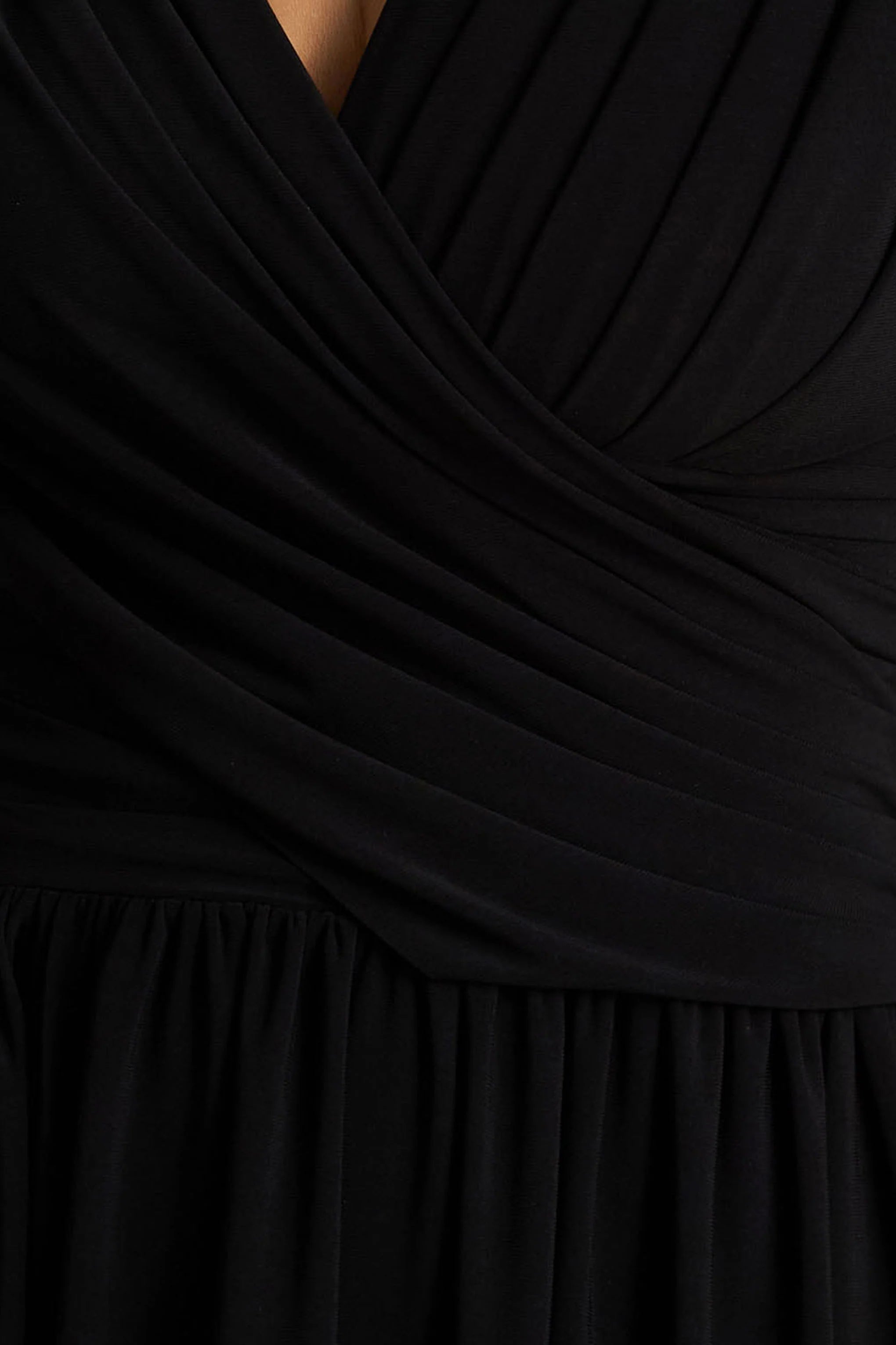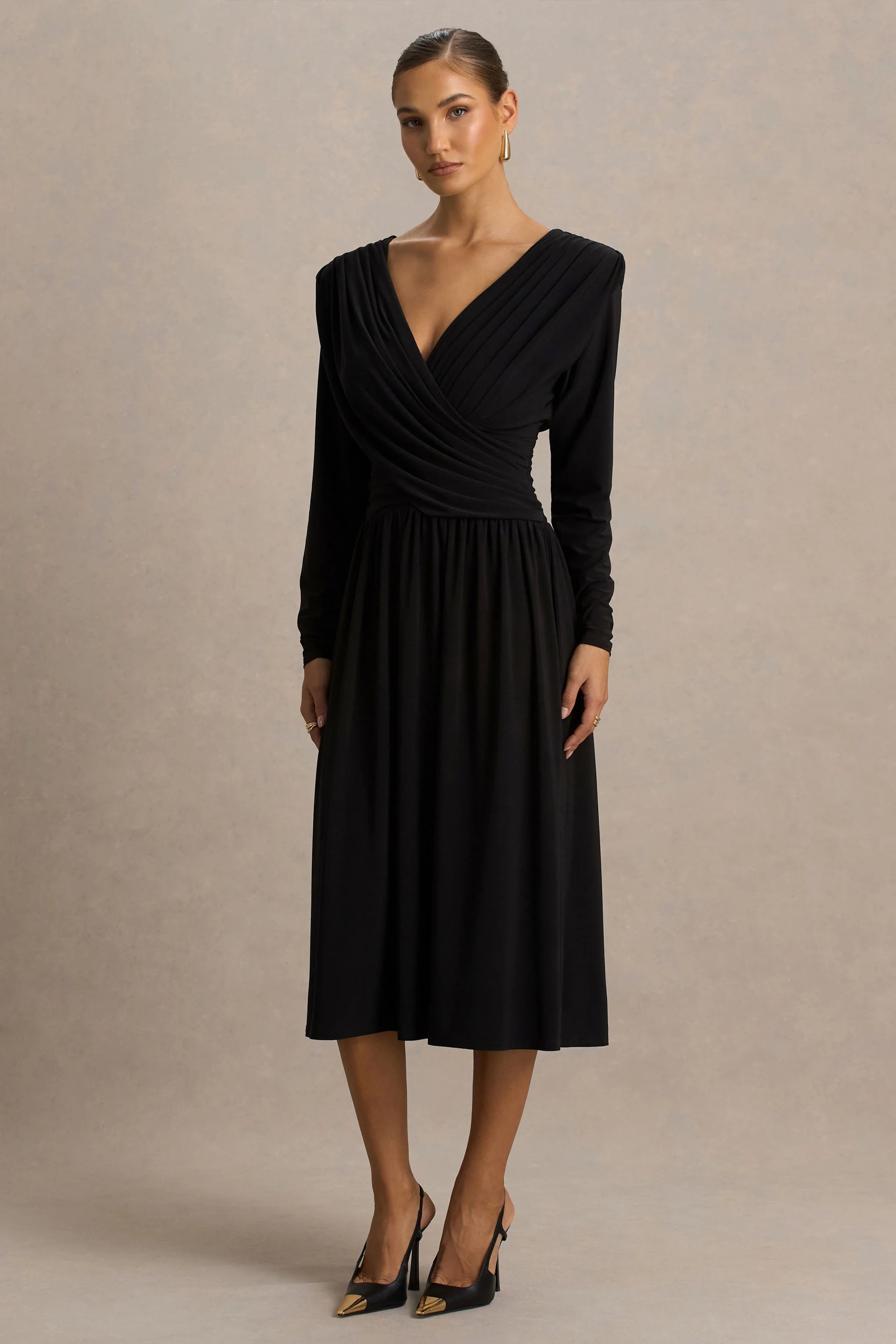 Turn heads with Alexis, as striking piece that embodies understated glamour. Cut from our premium black stretch jersey, this figure-flattering midi silhouette flatters all the right places while offering a striking finish. A plunging neckline and wrapped bodice create a sculpted shape, perfectly balanced by loose-fitting long sleeves for an effortless touch of elegance. With draped detailing that enhances every curve, Alexis is the ultimate dress for elevated evenings and unforgettable moments.