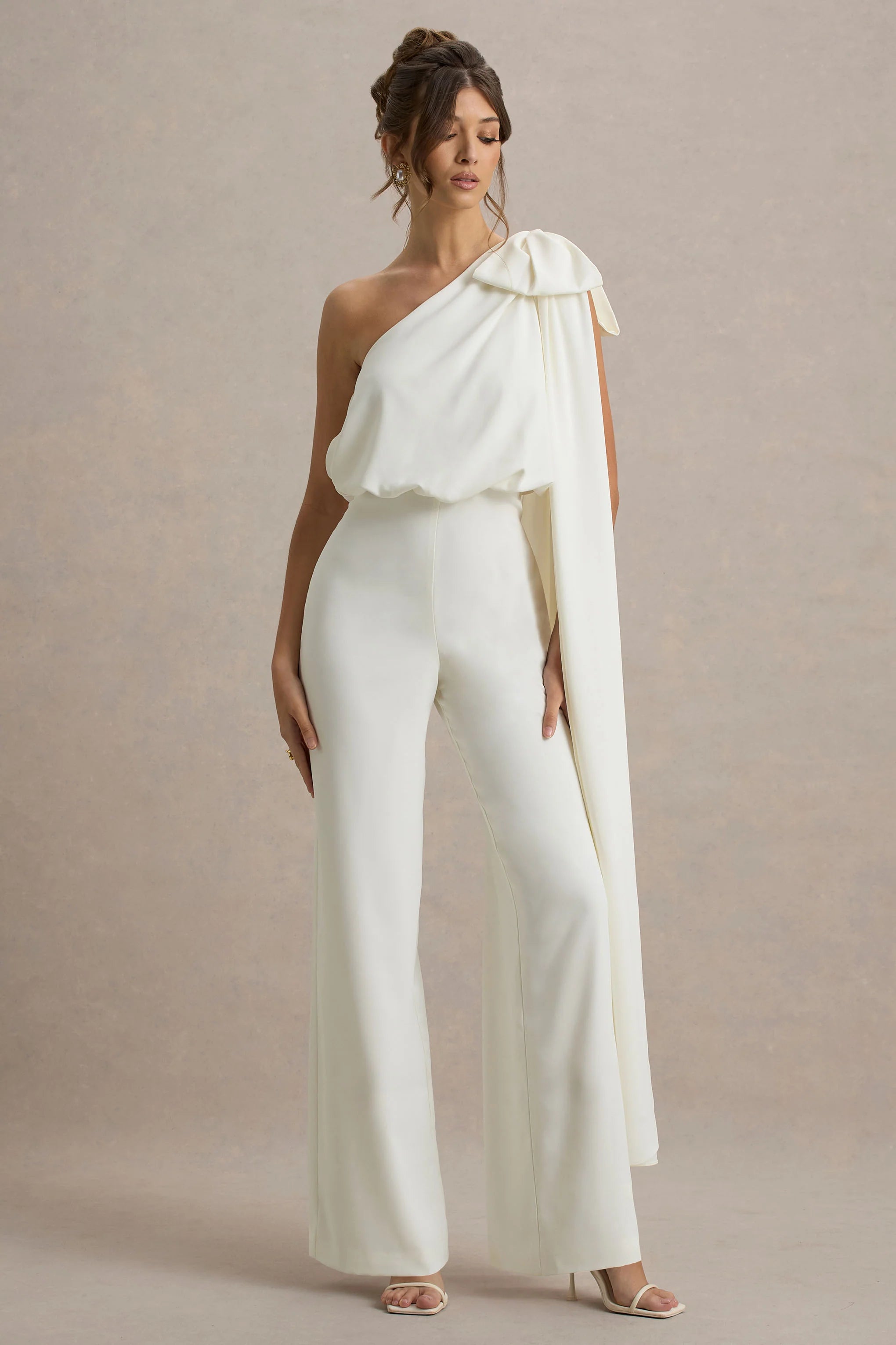 Adorned with head turning details, in Alice you will make an entrance at any occasion. Curated in a timeless cream shade of our premium stretch crepe, this jumpsuit flatters your figure from all angles. Featuring a modern asymmetric neckline that is elevated with a statement bow detail, which beautifully cascades into a striking sash. This piece is a seamless blend of timeless femininity and playful elegance. Style with a clutch bag and sleek heels for a poised and chic look.