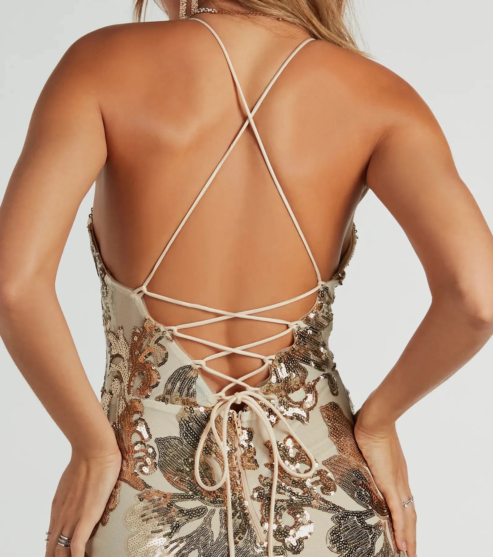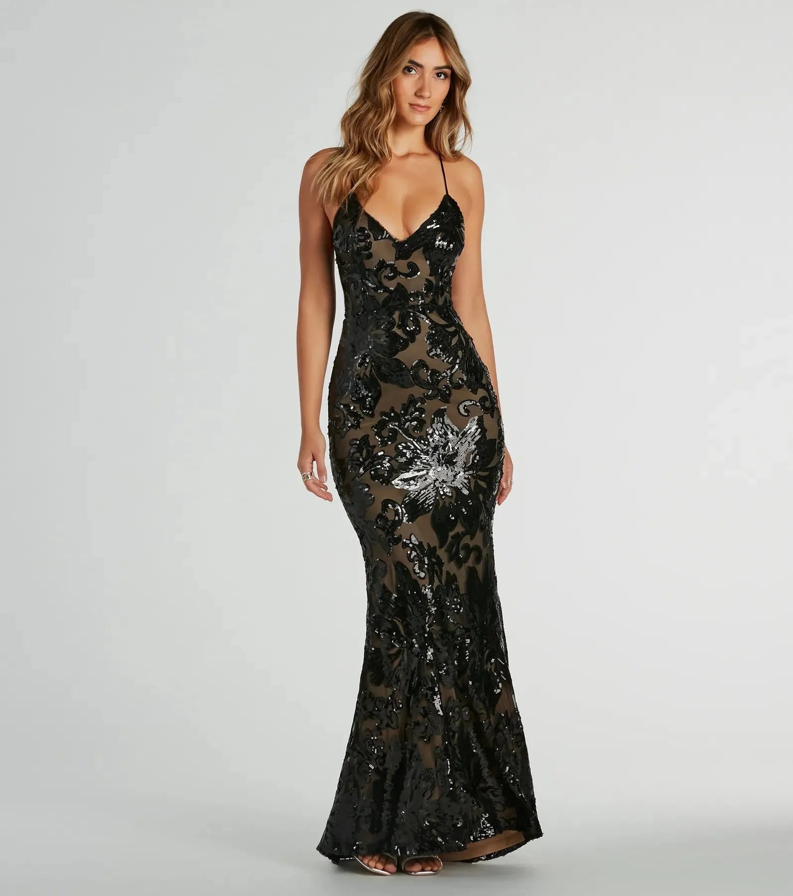 Make it an evening to remember in the Alison sequin formal dress at prom, galas, or red carpet events! Glistening sequins in a stunning pattern give this formal dress a sparkling allure perfect for standing out. This luxurious dress features a flattering V-neckline and spaghetti straps, while the lace-up open back adds a touch of head-turning elegance. The mermaid silhouette and floor-length hem create a graceful and captivating look, adorned with a lavish sequin embellished pattern. Complete the look in a gorgeous and heels.?