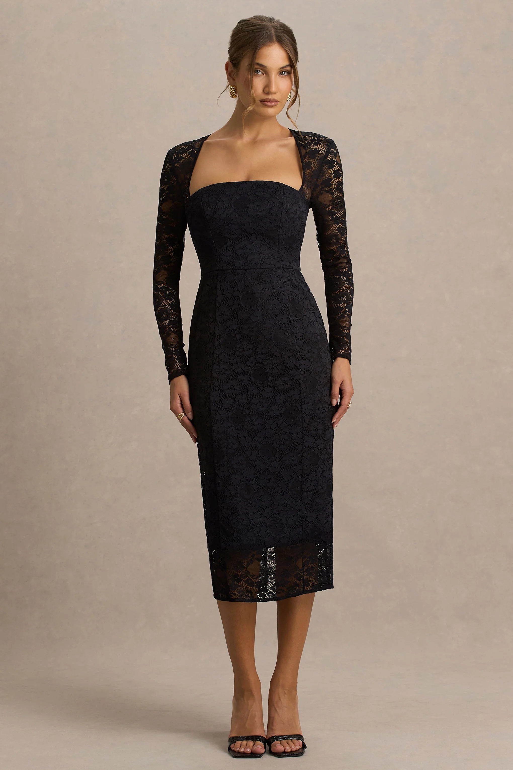 Make a statement in Alissa, where timeless elegance meets modern allure. Crafted in our premium black lace, this midi dress is a must-have in your occasion wear wardrobe this season. Designed with a flattering square neckline and long sleeves for a chic, sophisticated silhouette. A daring centre-back split adds just the right amount of drama, perfect for turning heads at any event. Alissa is your go-to for unforgettable style.