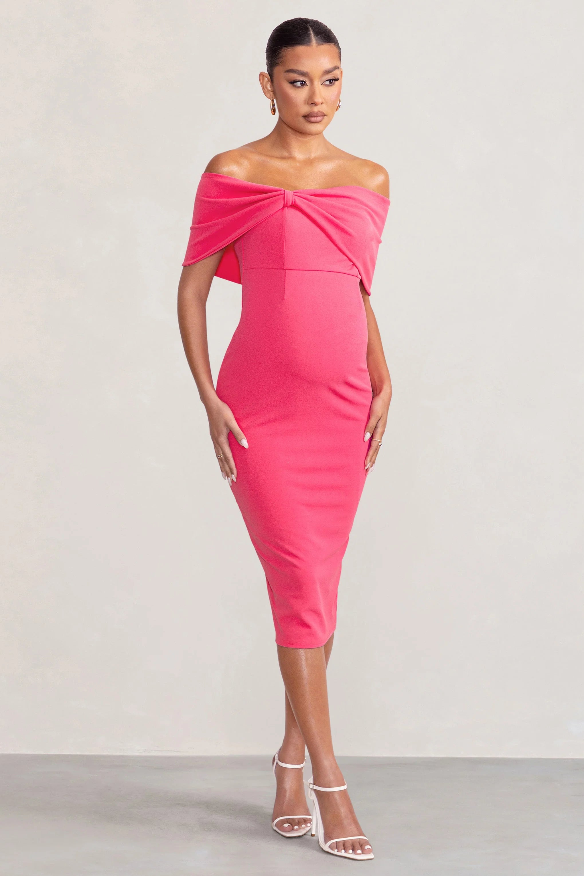 Meet Alyssa, our must-have midi dress made from a hot pink jersey that's both supportive and sculpting. Sure to turn heads at any formal event from birthdays to baby showers, this pink maternity dress features a Bardot neckline wrapped by a large bow and a split fitted skirt.