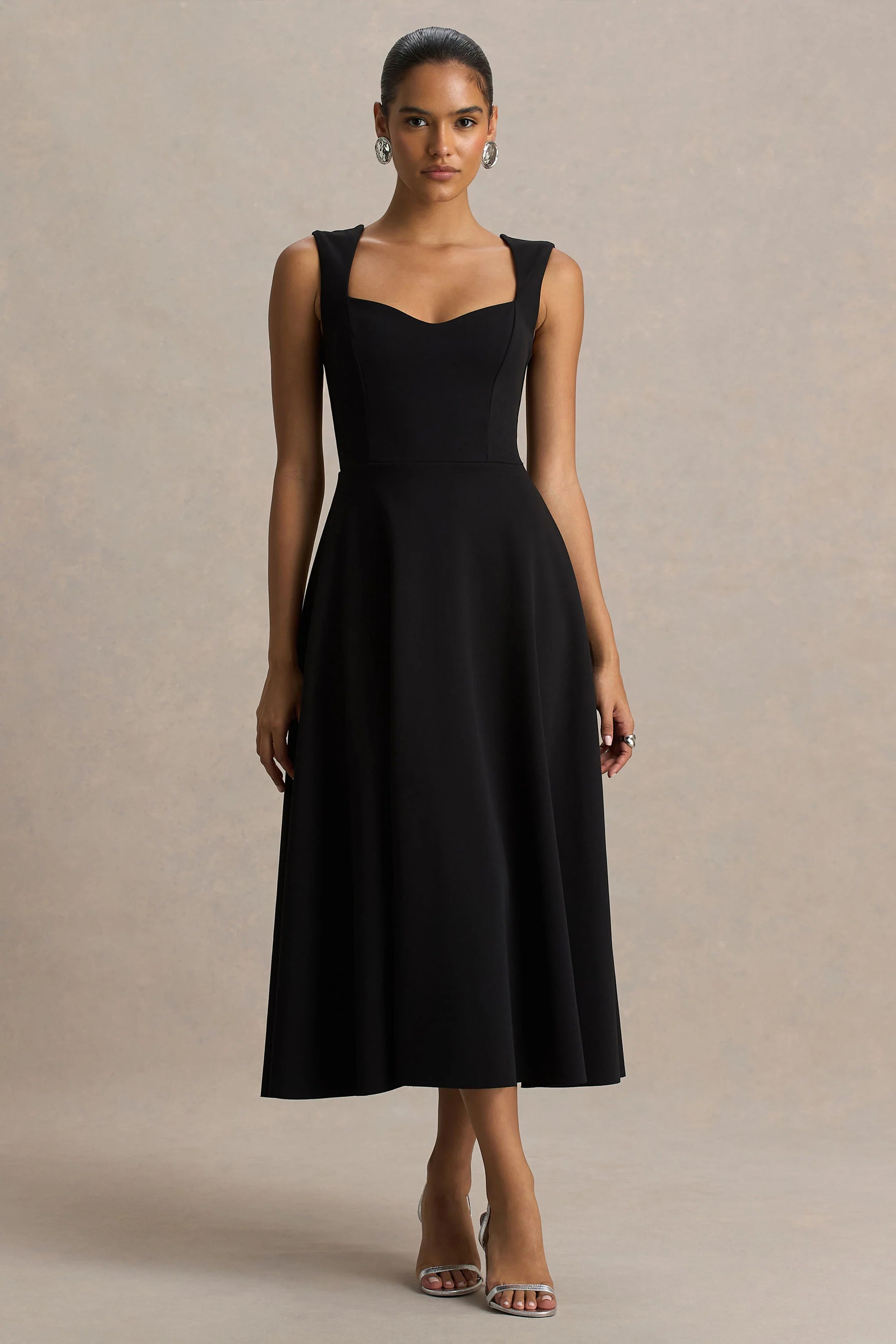 Fun, flirty and breezy, Andromeda will quickly become your go-to this season. Curated in our premium scuba crepe in a dashing black hue, this midi showcases a silhouette made to flatter all. The sweetheart neckline transforms beautifully into a voluminous skater skirt, seamlessly creating a romantic look. Pair your Andromeda with statement accents for the perfect ensemble.