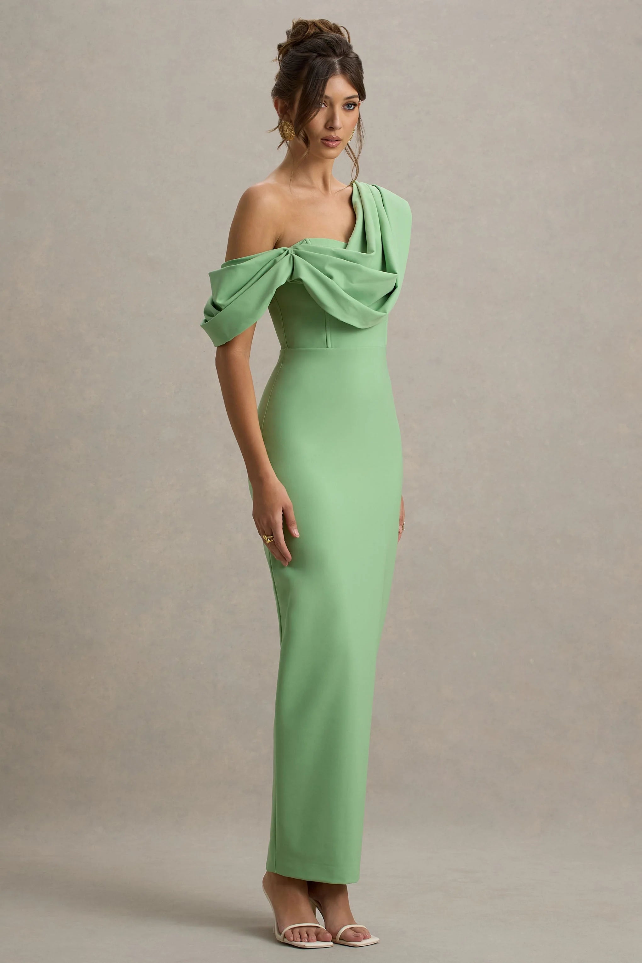 Feminine and delicate, introducing our latest maxi Angelina. Cut in our premium scuba crepe, to sculpt your figure, in a bold shade of green. Featuring an asymmetric neckline to sculpt your shoulders, with a draped detail for a romantic edge. Perfect for any occasion this season, paired with a strappy heel and a glamorous up do.