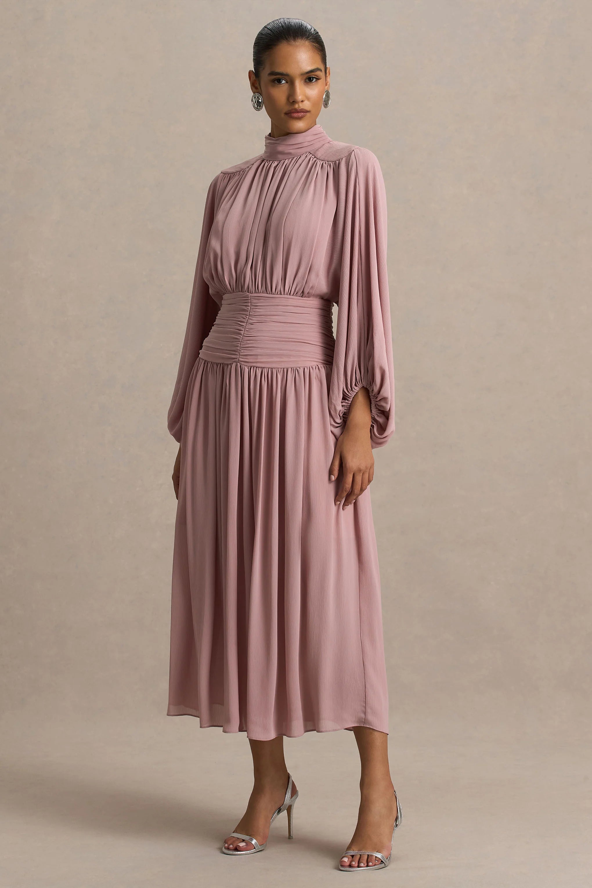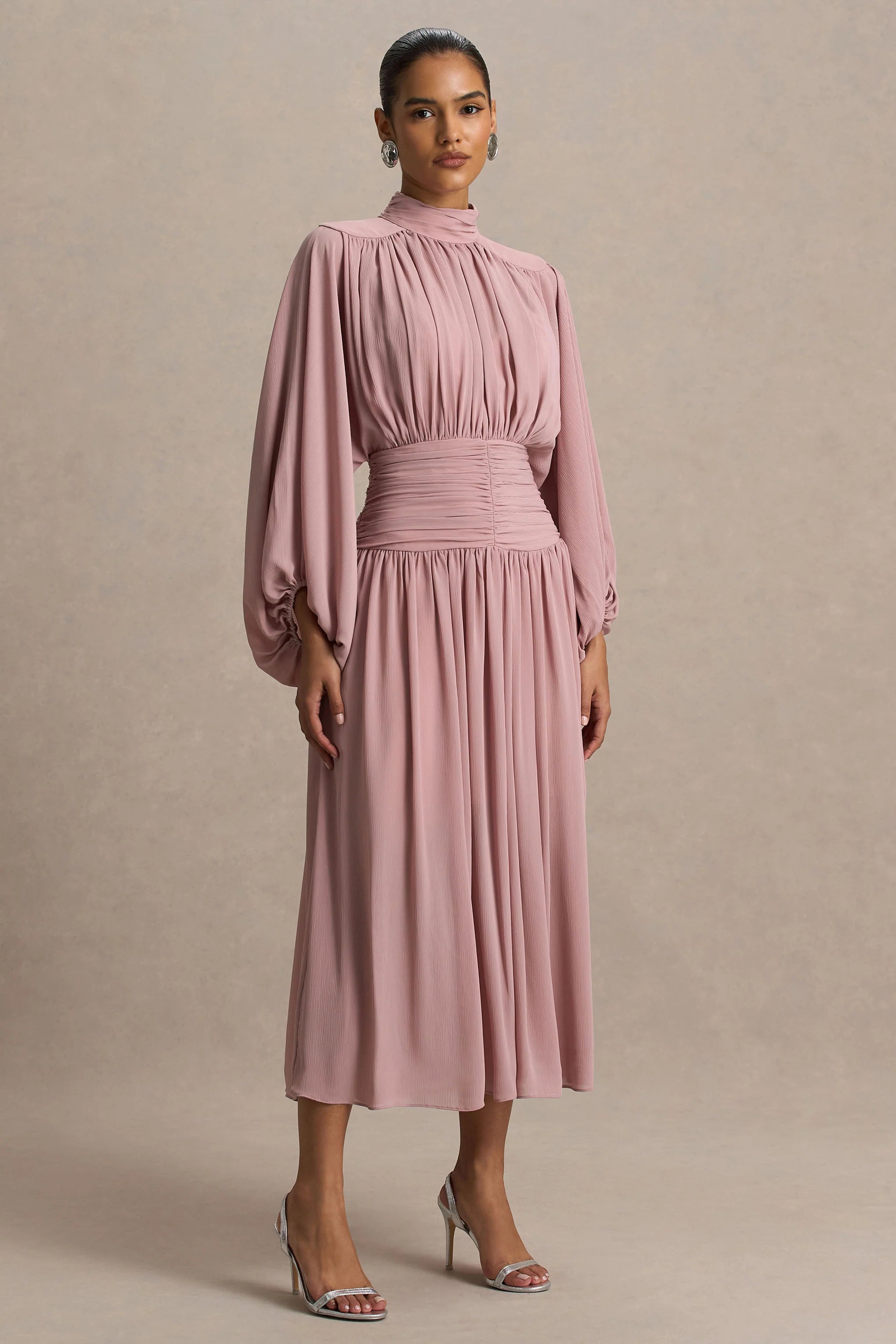 Designed to embody timeless romance, Annabel is a sophisticated style made for elegant moments. Crafted from our premium dusty pink chiffon, this midi dress moves beautifully with every step, giving it a feminine finish. The refined high neckline frames the decolletage, while soft pleated detailing and a chic drop waist create a graceful silhouette. Perfect for weddings, garden parties, and occasions that call for effortless sophistication.