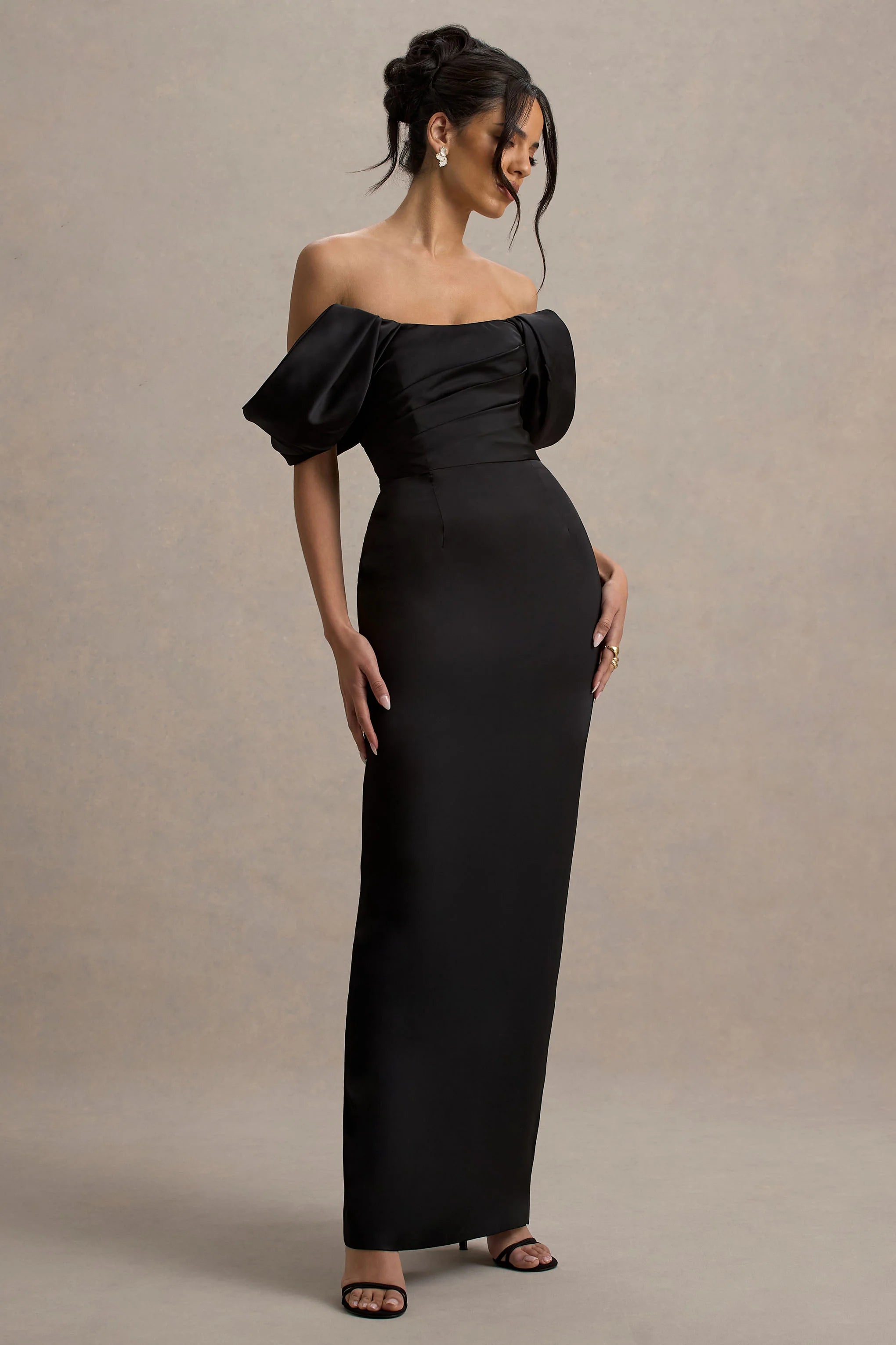 Dripping in elegance, our latest maxi Annita has arrived. Cut in our premium satin for a luxe finish, in a black hue. The bardot neckline is complimented by soft draping sleeves, highlighting your decolletage for a romantic and feminine feel. Perfect for weddings or any black tie events this season, paired with a sleek up do and gold jewellery.