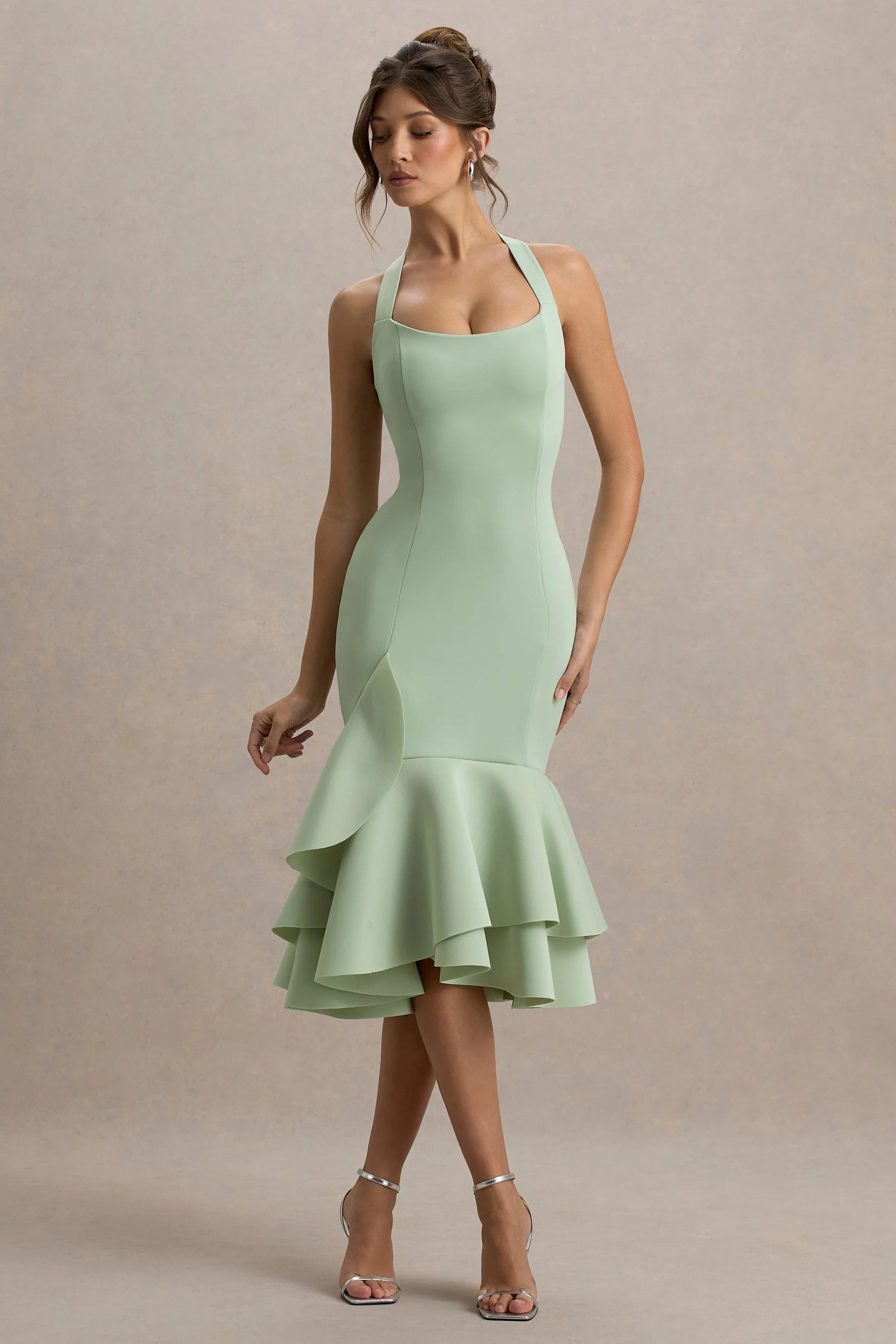 Arriving in a new season silhouette, Arla is the perfect piece for any special event. Crafted in a light green shade of our signature stretch scuba crepe, this curve-enhancer boasts a self-tie neckline and eye-catching ruffled hemline. For an elevated look, try teaming yours with some sparkling accents and a tousled bun.