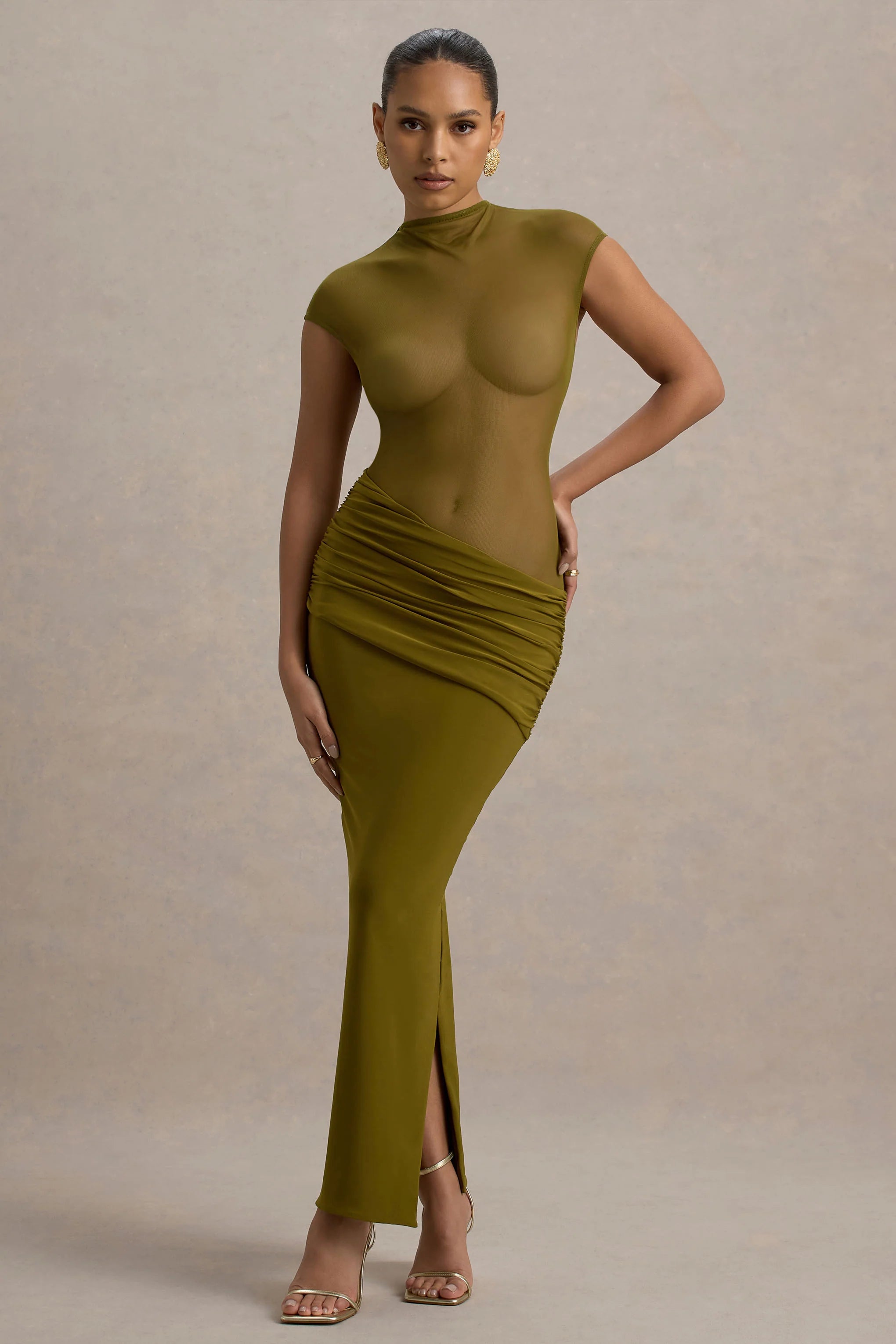 If you're searching for a cool girl look, then look no further than Asia. Comprised of a premium green stretch jersey and sheer mesh layers, this maxi dress is a staple for every modern muses wardrobe. Style with chunky gold jewellery and sleek straight hair for the ultimate party girl style this season.