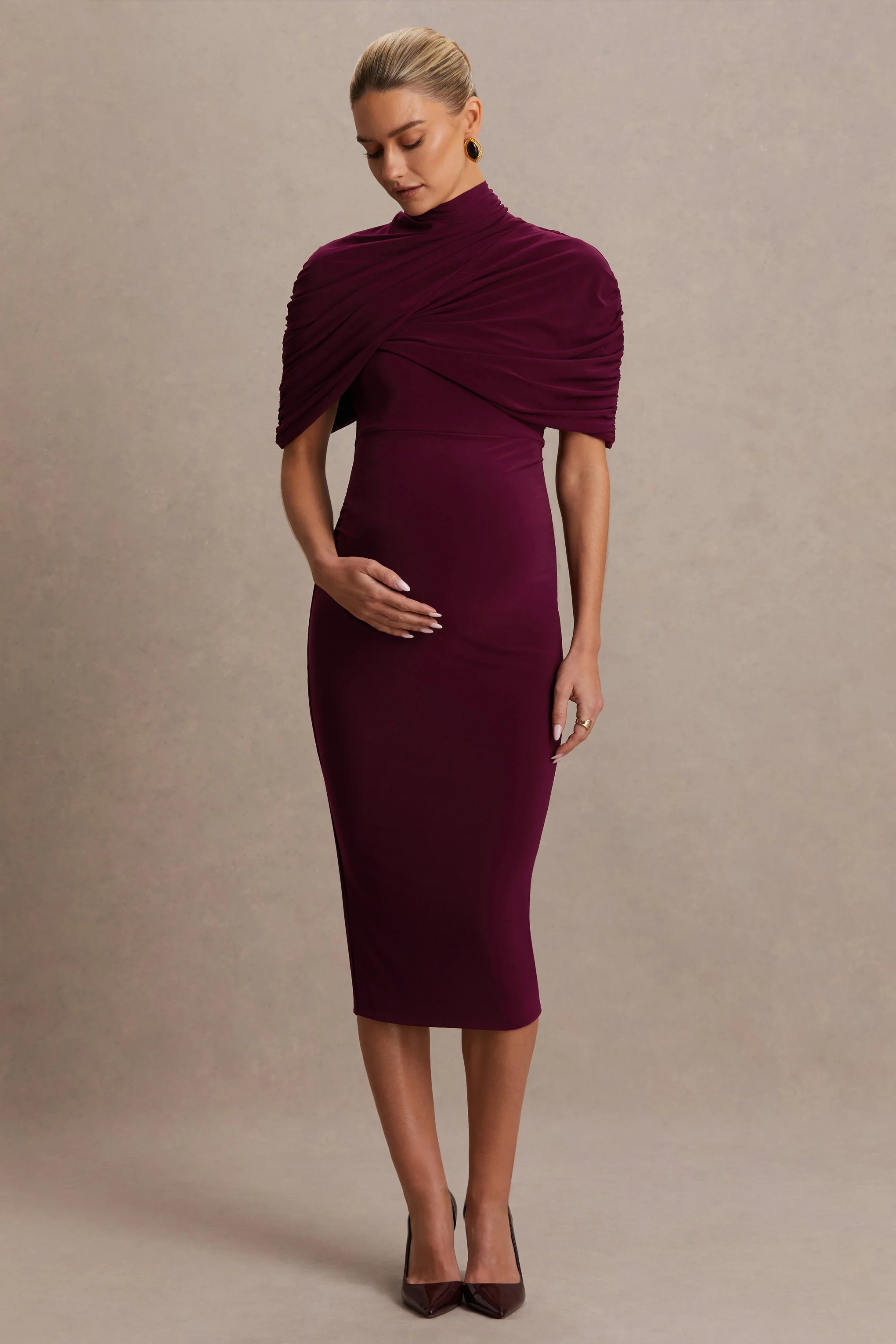Exude effortless elegance and grace in Augustina. Crafted from our premium stretch jersey, to sculpt your silhouette, this burgundy midi dress is the perfect statement maker for your next special occasion. Designed with a chic high neck and cape sleeves, this piece is the epitome of sophistication. Finished with expertly placed ruched detailing to flatter your figure, in Augustina you will feel as good as you look.