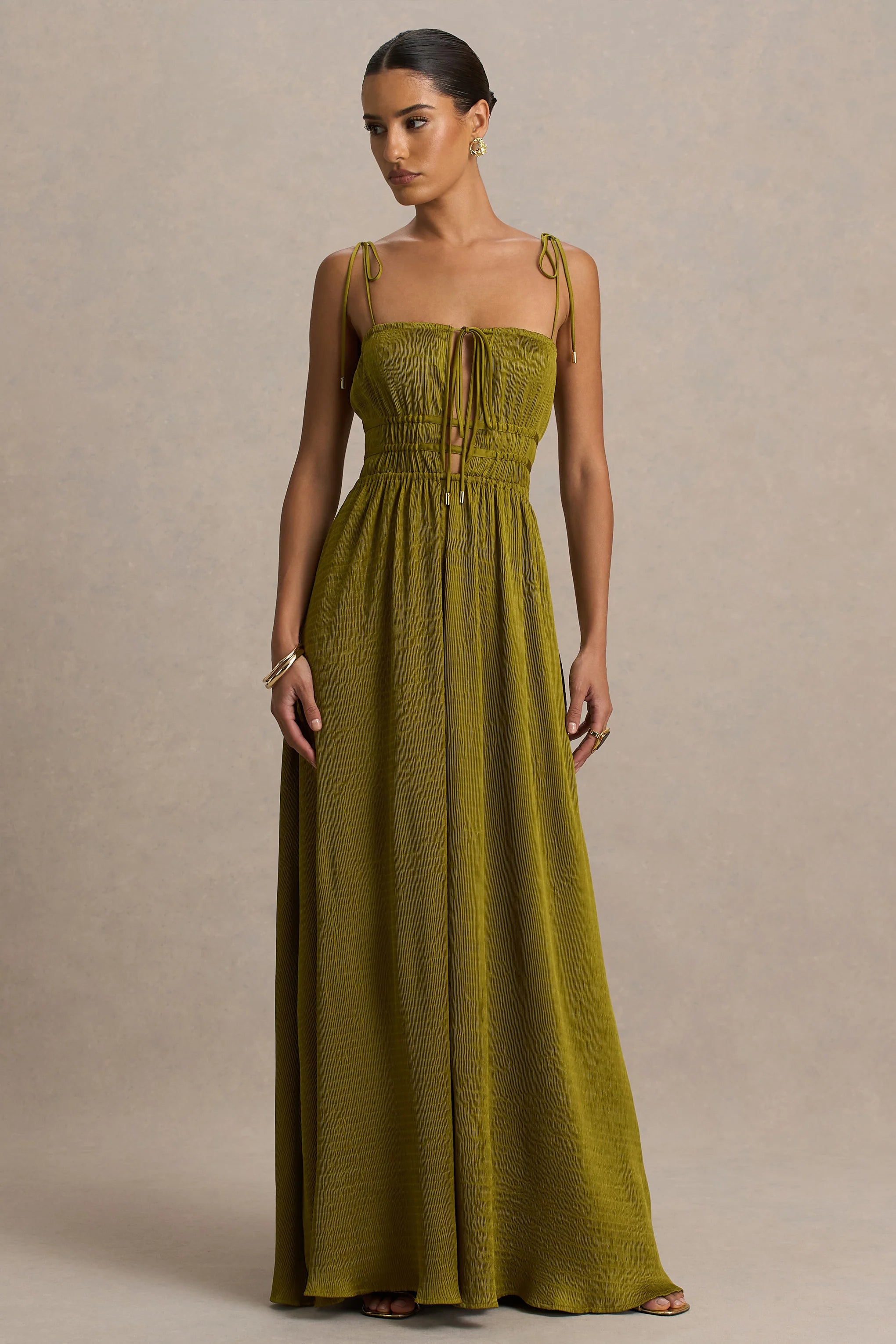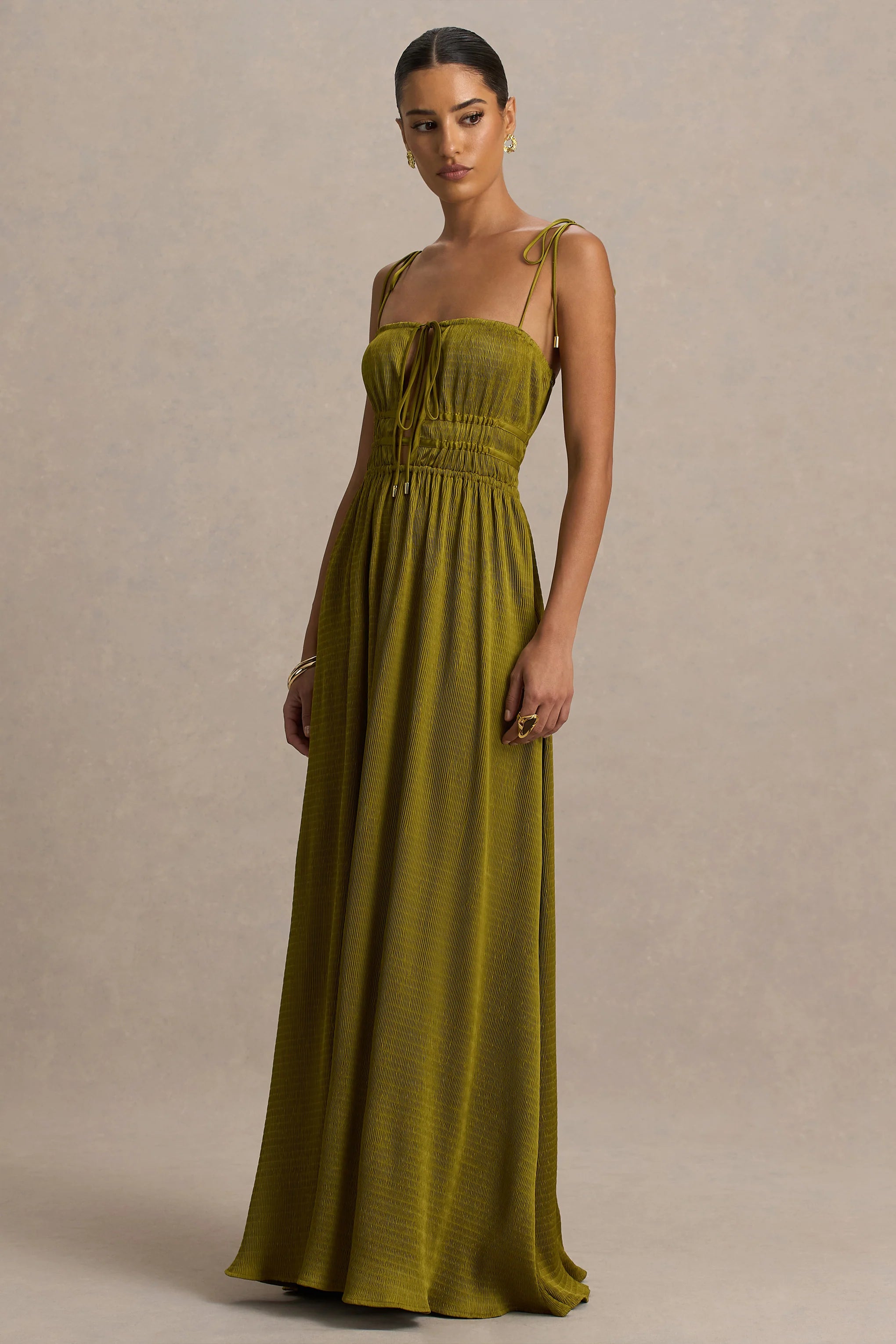 Turning heads is guaranteed in Azalea, a bold blend of elegance and allure. Designed in a rich green satin that catches the light with every step, this stunning piece drapes beautifully over the body for a high-impact finish. The flattering square neckline is framed by self-tie straps, while a delicate chest cut-out adds a touch of allure. The bodice is cinched with feminine self-tie detailing, and soft pleats flow into a sweeping maxi-length skirt that moves with grace. Style Azalea with minimal accessories and let the dress speak for itself.