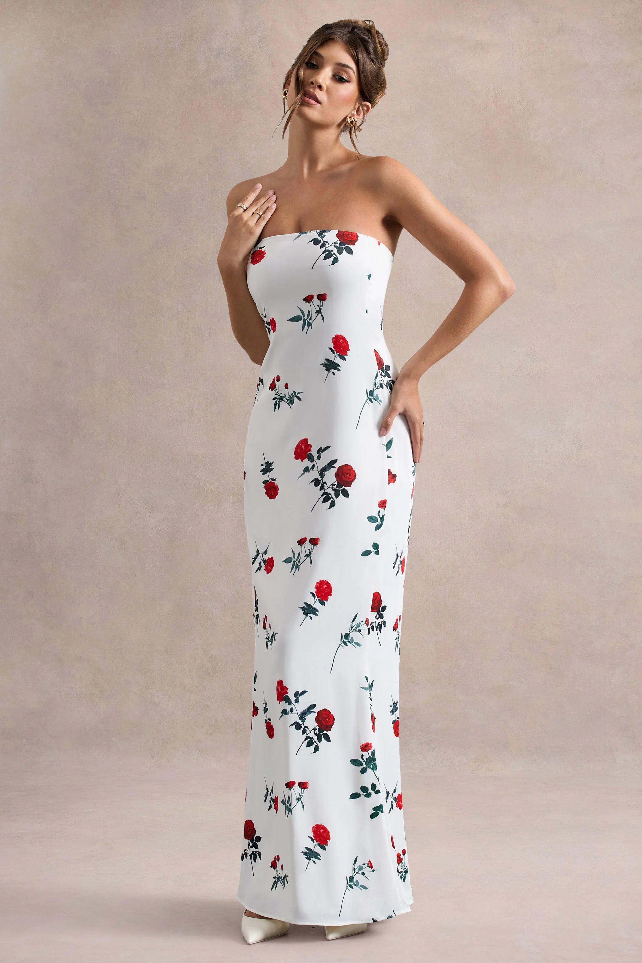 Showcasing a silhouette of pure timeless elegance is Azra. This maxi dress arrives in a romantic rose print of a premium flowing satin and boasts a simple strapless neckline, with an internal boned corset for added structure. Style this minimalistic maxi with some simple gold accents to complete your look.