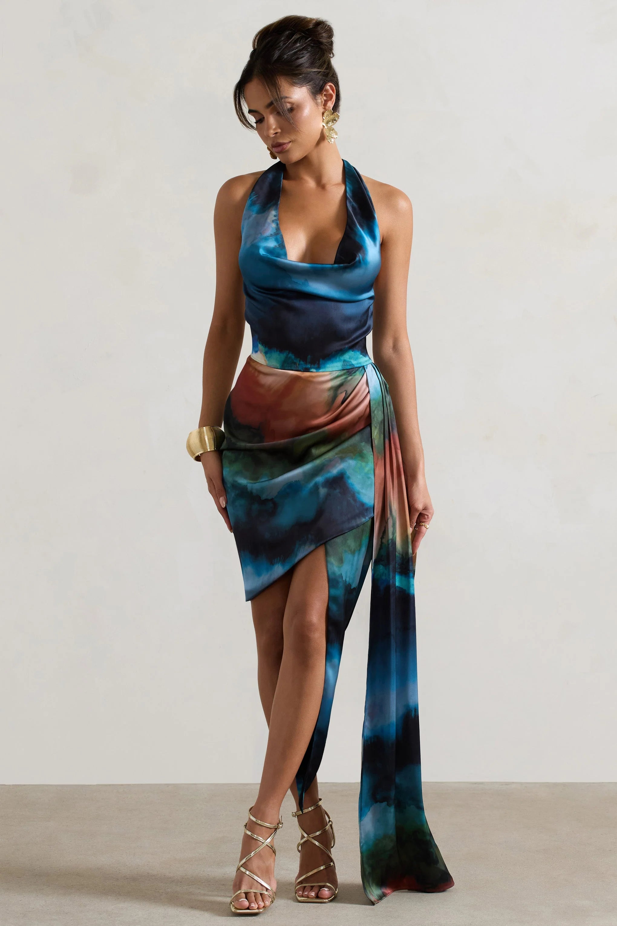 A dress that's been designed for tropical nights is Bali. This stunning satin midi dress arrives in a blue blurred print mixed with orange and green tones for an artful watercolour effect. Bali boasts a daring cowl neckline with self-tie halter straps and is finished with a playful drape. Style this mini with some gold accents for the perfect sunset cocktails attire.