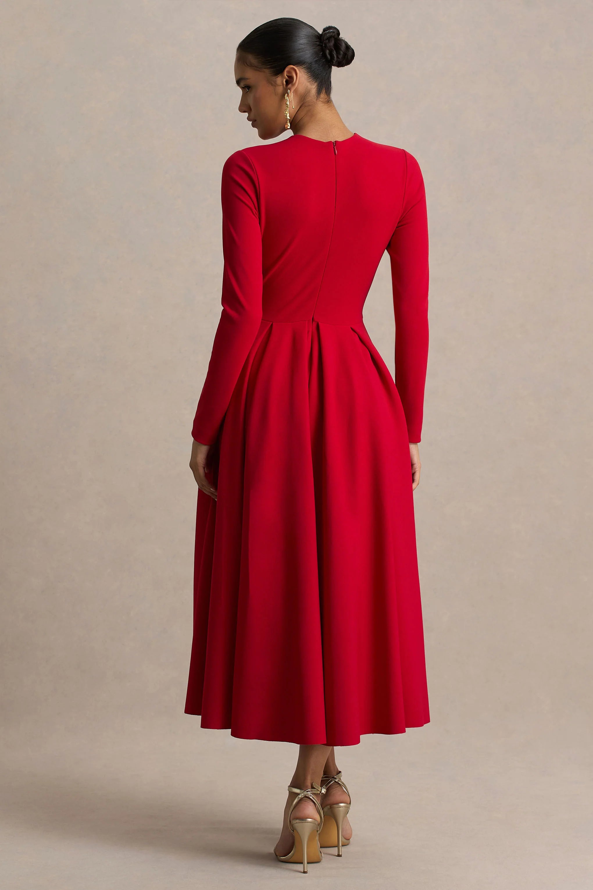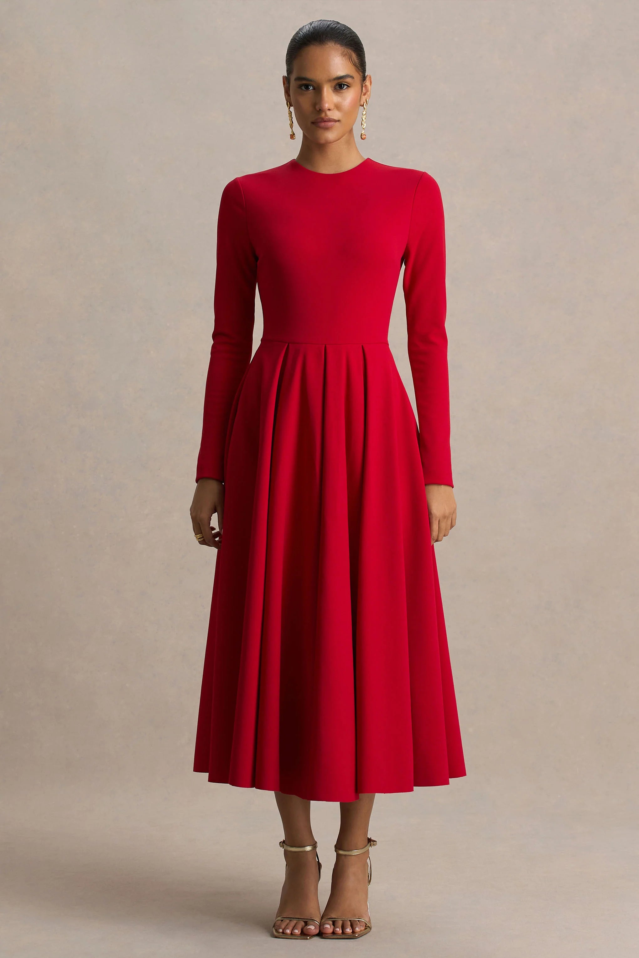 Sleek, structured, and endlessly sophisticated, meet Bellamy. Crafted from our premium scuba crepe in a bold red hue, this midi silhouette is all about timeless elegance with a modern twist. Designed with a clean crew neckline and long, sleeves, Bellamy creates a streamlined shape that enhances your curves while keeping the look elegantly refined. Style with striking earrings and a sleek up do, for a look that'll capture the rooms attention.