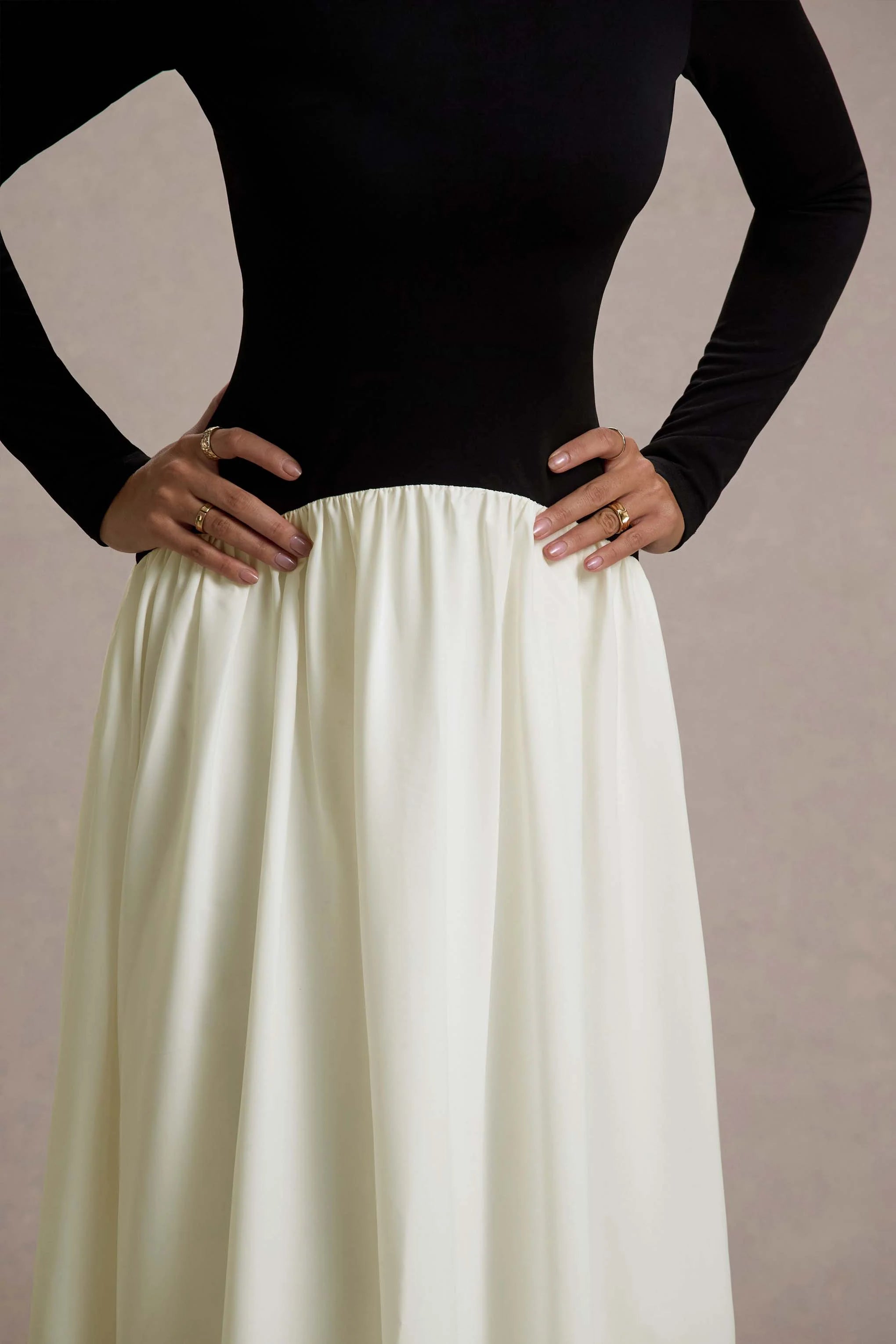 Defined by bold contrasts and timeless elegance, Benedetta is a striking choice for your next special occasion. Crafted from our luxurious crepe and taffeta, this maxi dress features a dramatic drop-waist design that elongates the figure while offering a flattering, structured fit. The long sleeves add a touch of sophistication, while the flowing skirt creates graceful movement with every step.