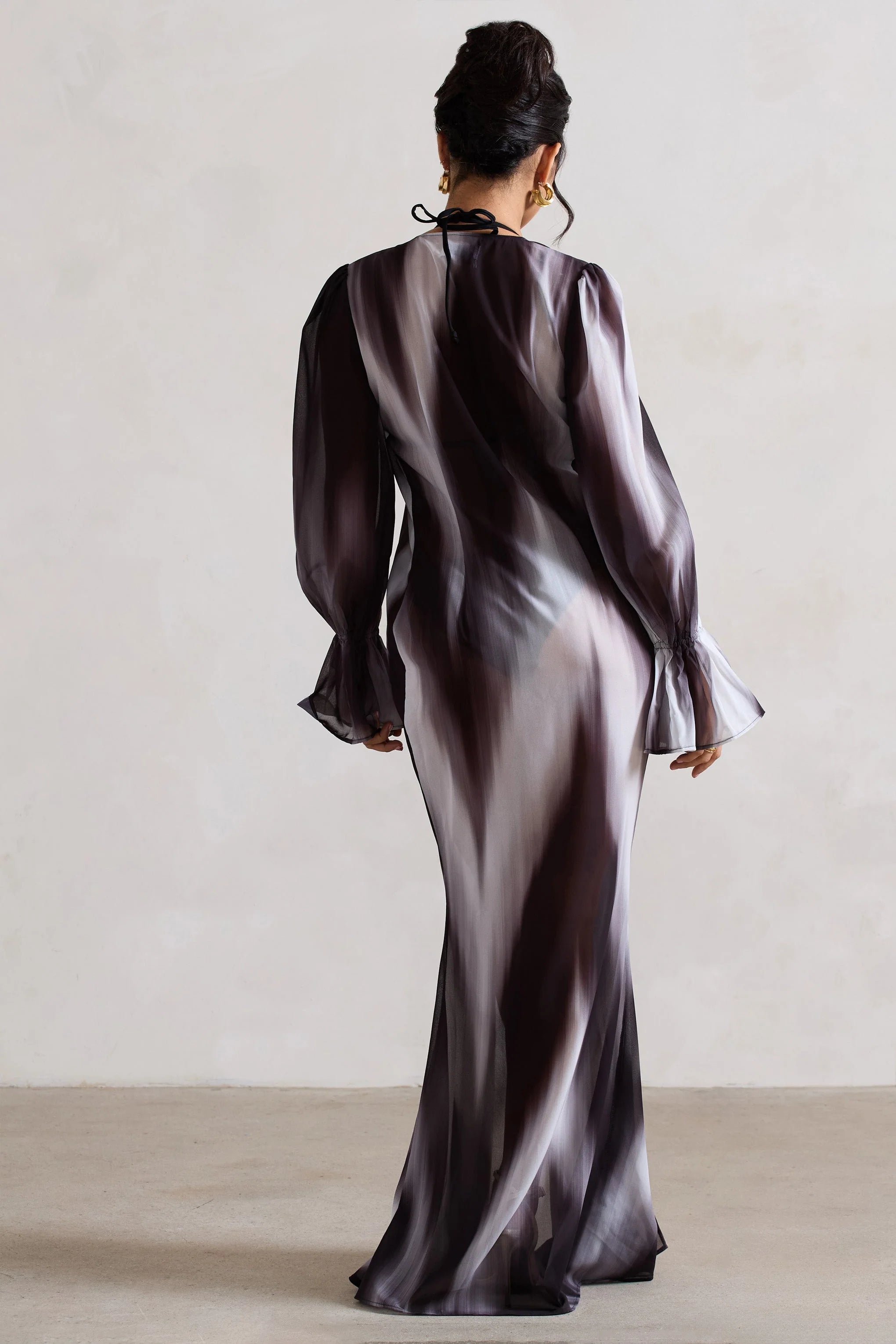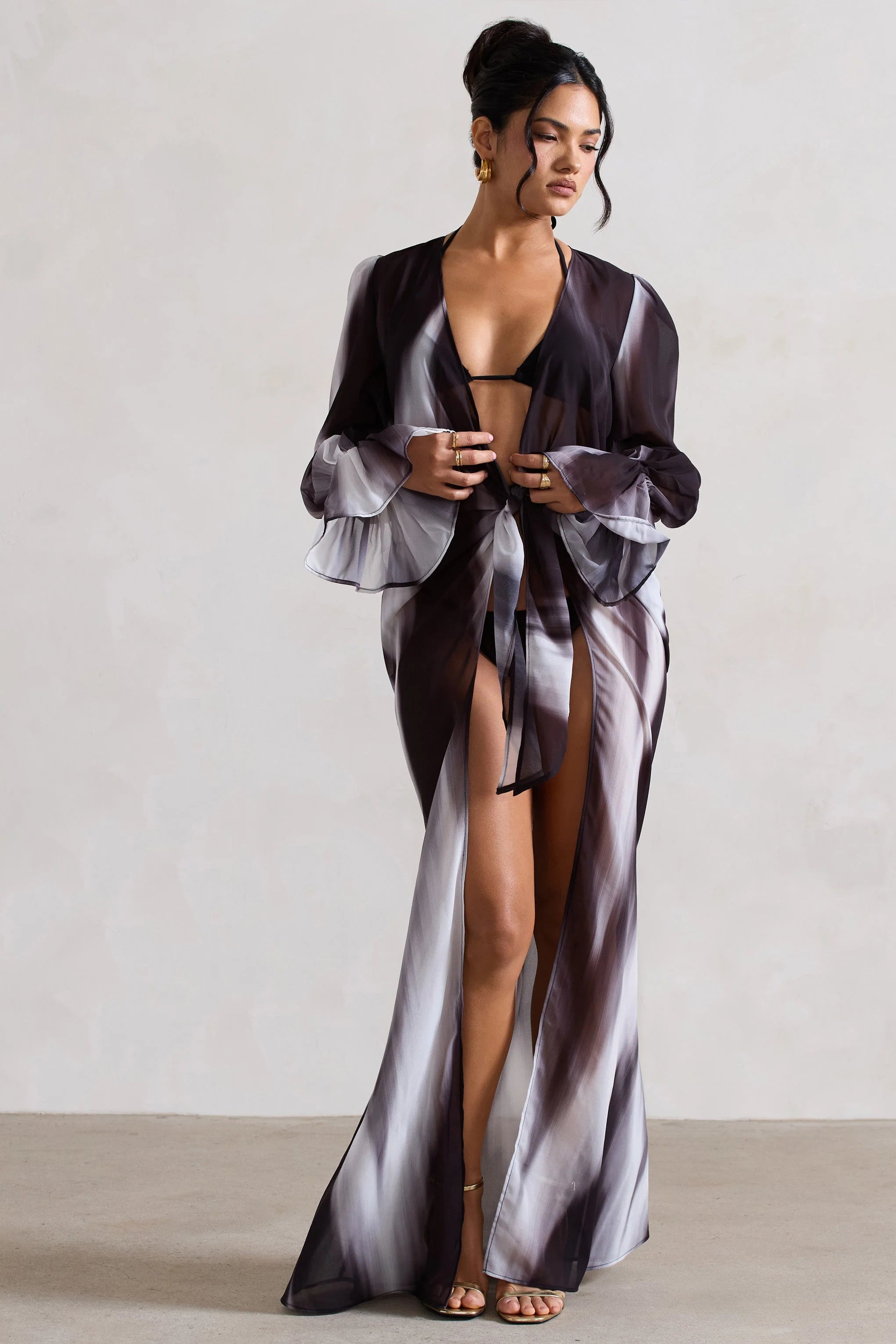 From sandy shores to festival stages, Bohemian is the perfect addition to a summer outfit. This maxi cover-up arrives in a black chevron print of a premium chiffon, with a self-tie waist to create your perfect fit. Whether its a beach bar or main stage Bohemian will elevate any look.