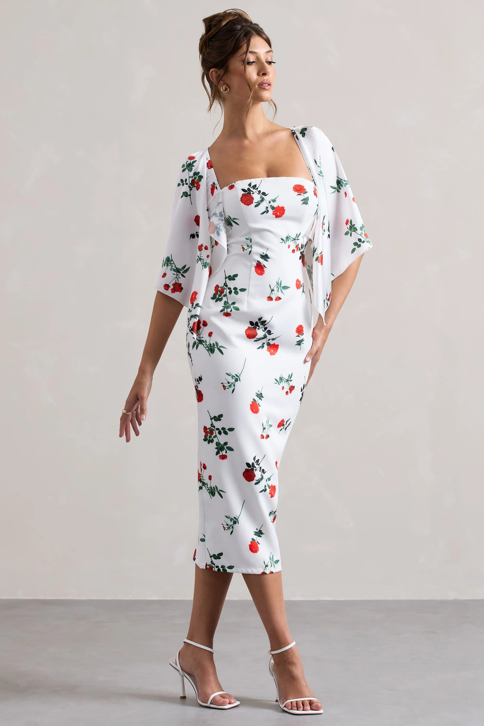 True to its name our Bonita midi dress boasts beautiful feminine charm. Crafted in a premium crepe in a blissful rose print with elegant satin cape sleeves. Style this stunning midi dress with a tousled bun for the ultimate occasion look.