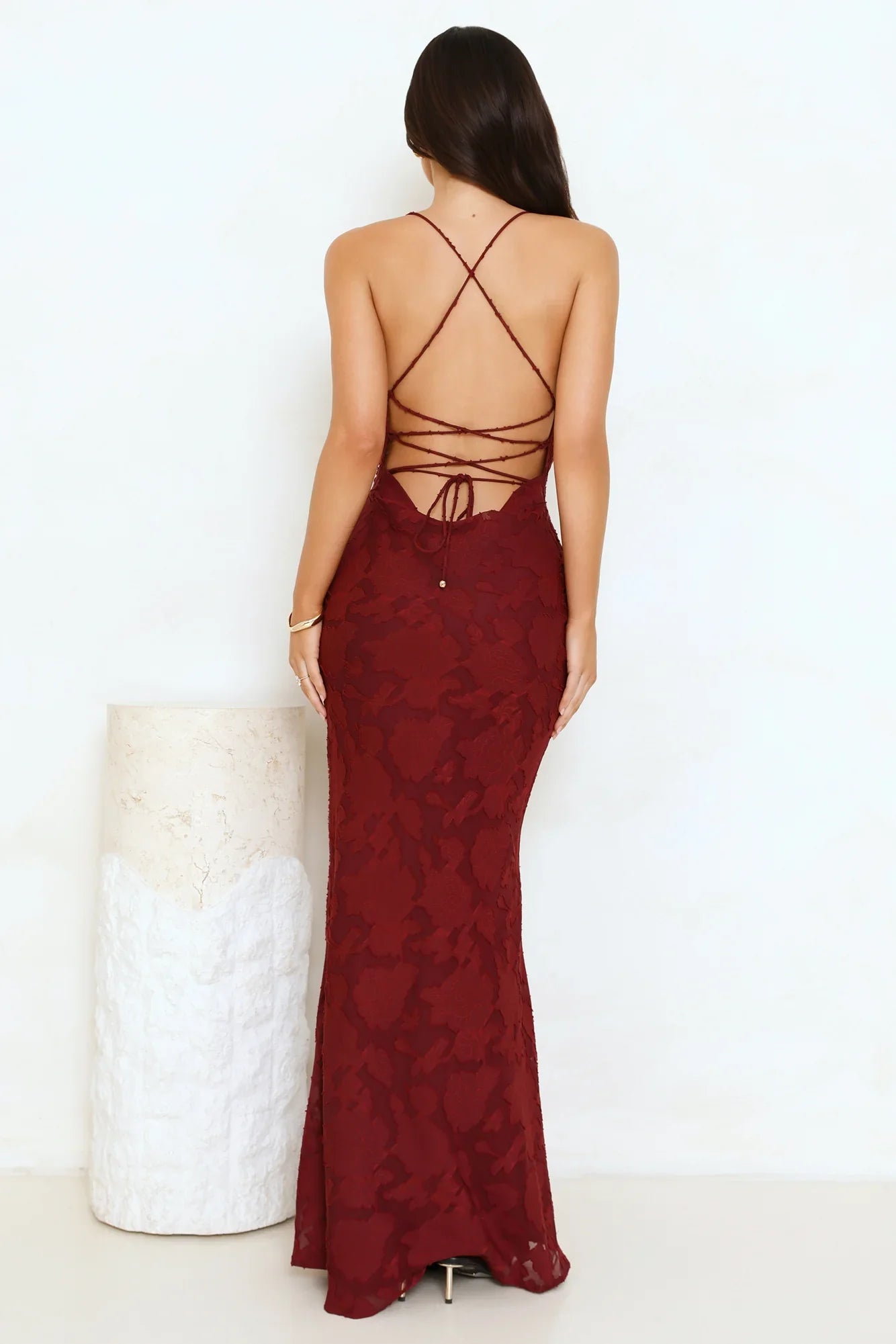 The Bridge To Wonderland Maxi Dress features a textured design fabric, a subtle cowl neck, and a crisscross back. Pair it with delicate heels and a clutch for an elegant, dreamy vibe.