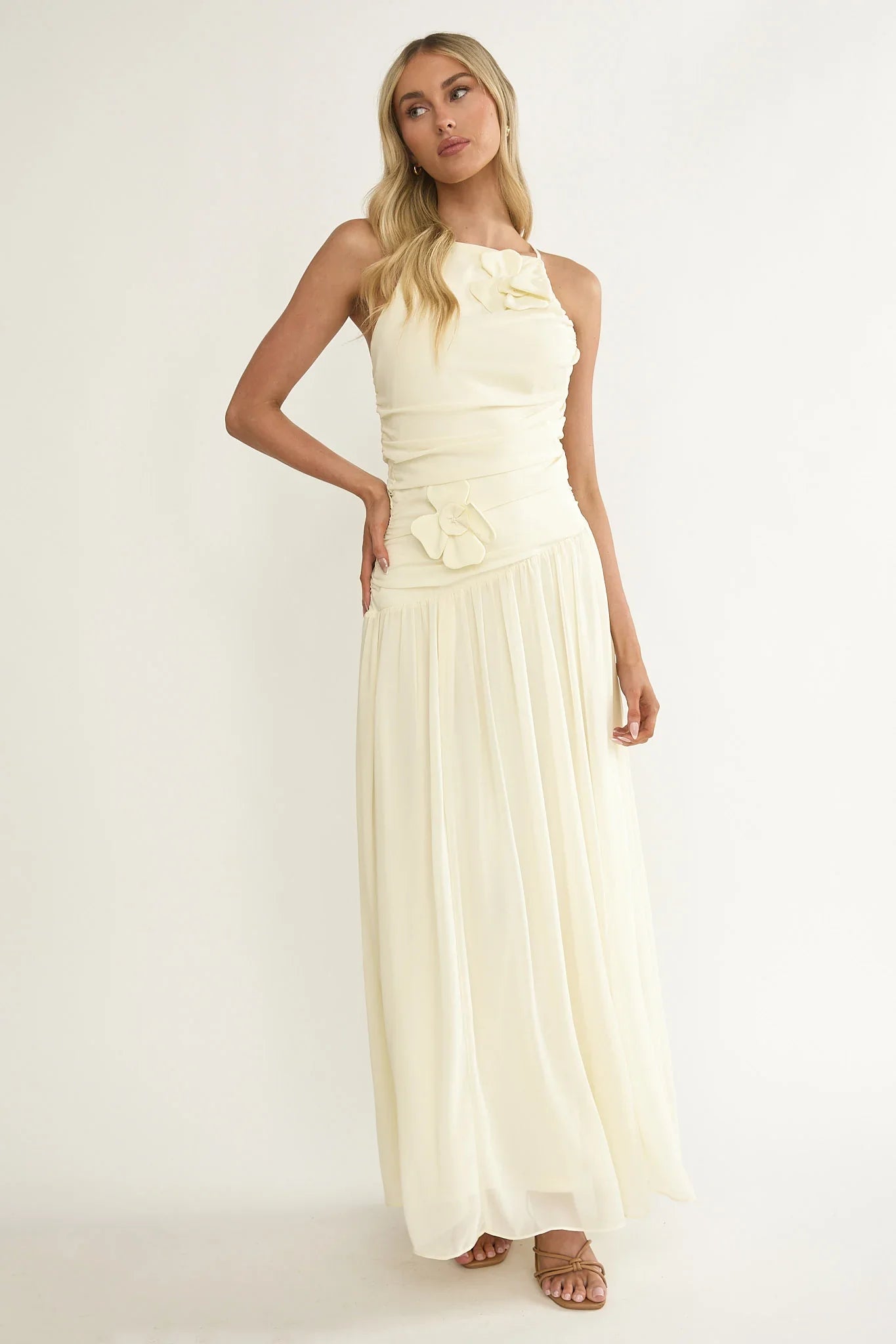 Steal the show in our super cute Brighten maxi dress. It features an asymmetric drop waist and pretty flower decorations. It's perfect for a special celebration or a glam night out with your girls. Team it with strappy heels and a chic clutch for a head-turning look.