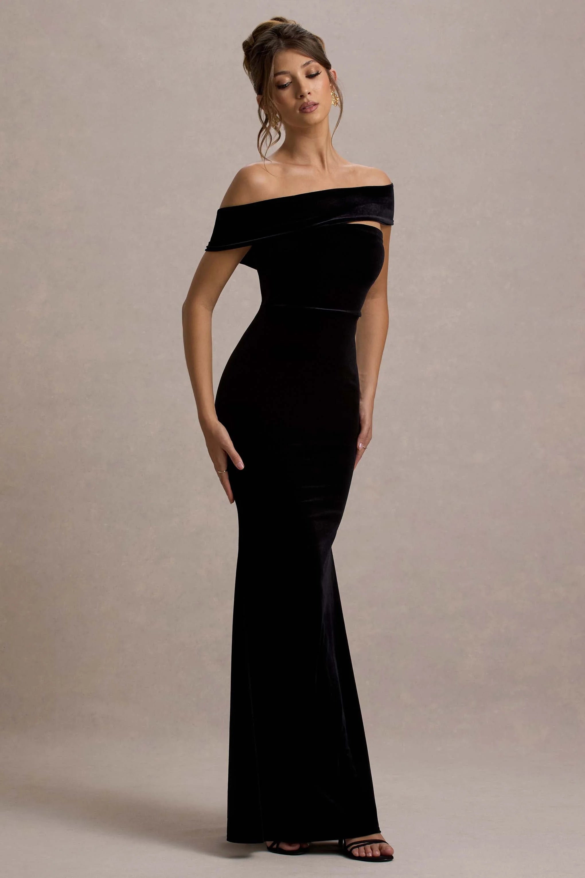 The Candela maxi dress in a glamorous black velvet seamlessly blends classic style and statement luxury. Featuring a sophisticated asymmetric bardot neckline and a waist-cinching bodice cascading hemline, Candela will effortlessly elongate your feminine silhouette.