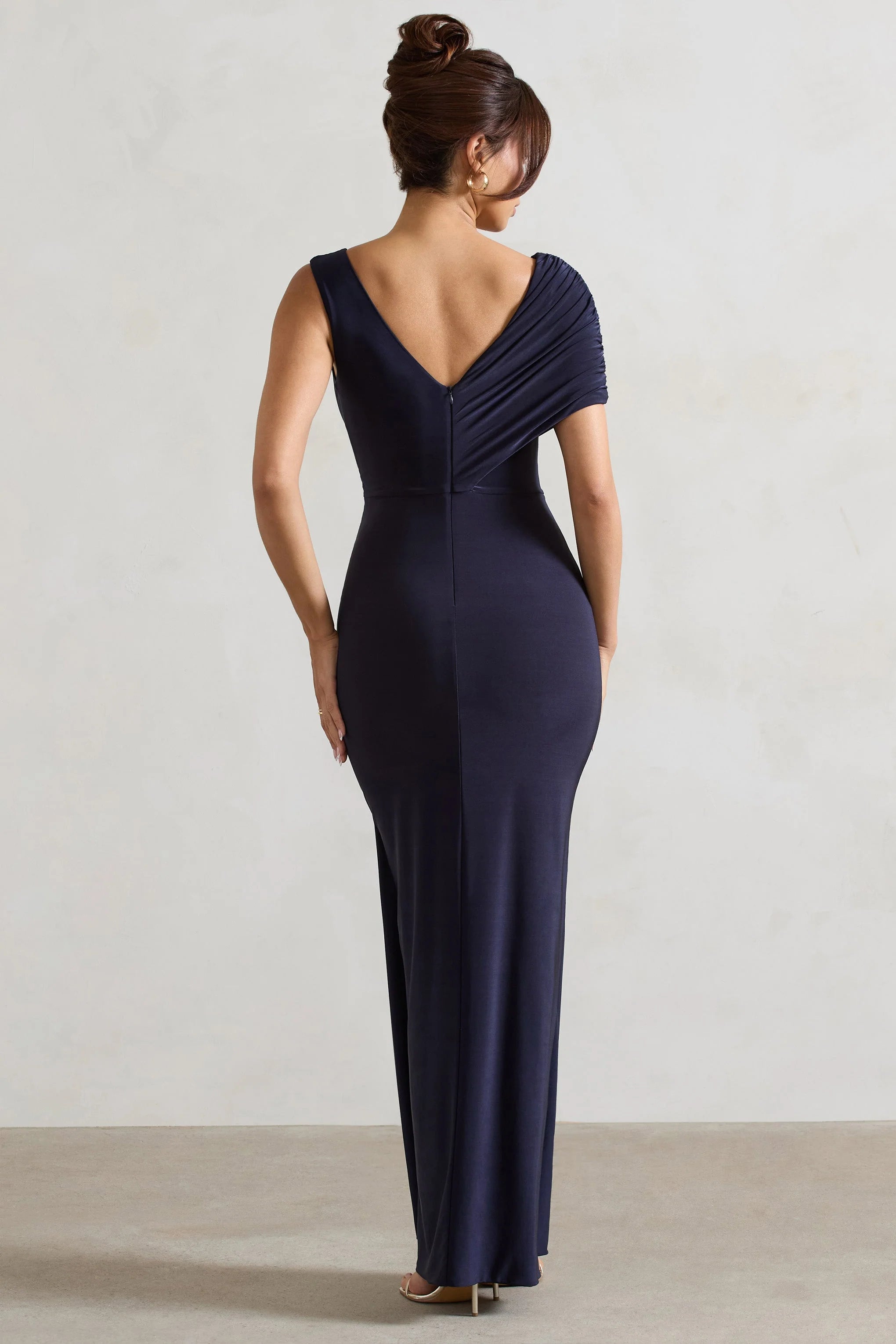Whether you're a bridesmaid or wedding guest, Capella is a timeless choice. Designed in our premium disco jersey, this wrap maxi dress was crafted to caress and cinch your natural curves. Complete with a single draped sleeve, style this navy maxi with a tousled bun to show off all it has to offer.