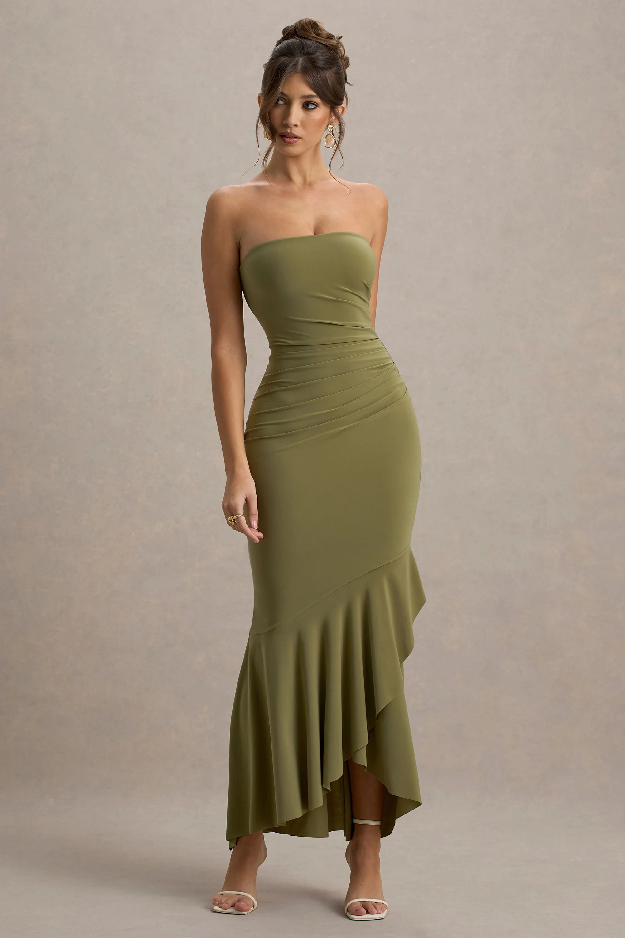 Craving a look as sweet as you? Then meet Capria, our beautiful bandeau maxi yet styled with flouncy frills, romantic ruffles and a sculpting wrap design. Made from premium stretch jersey in a seasonal shade of trending olive, you'll be sure to capture the gaze of everyone, in whatever room you enter.