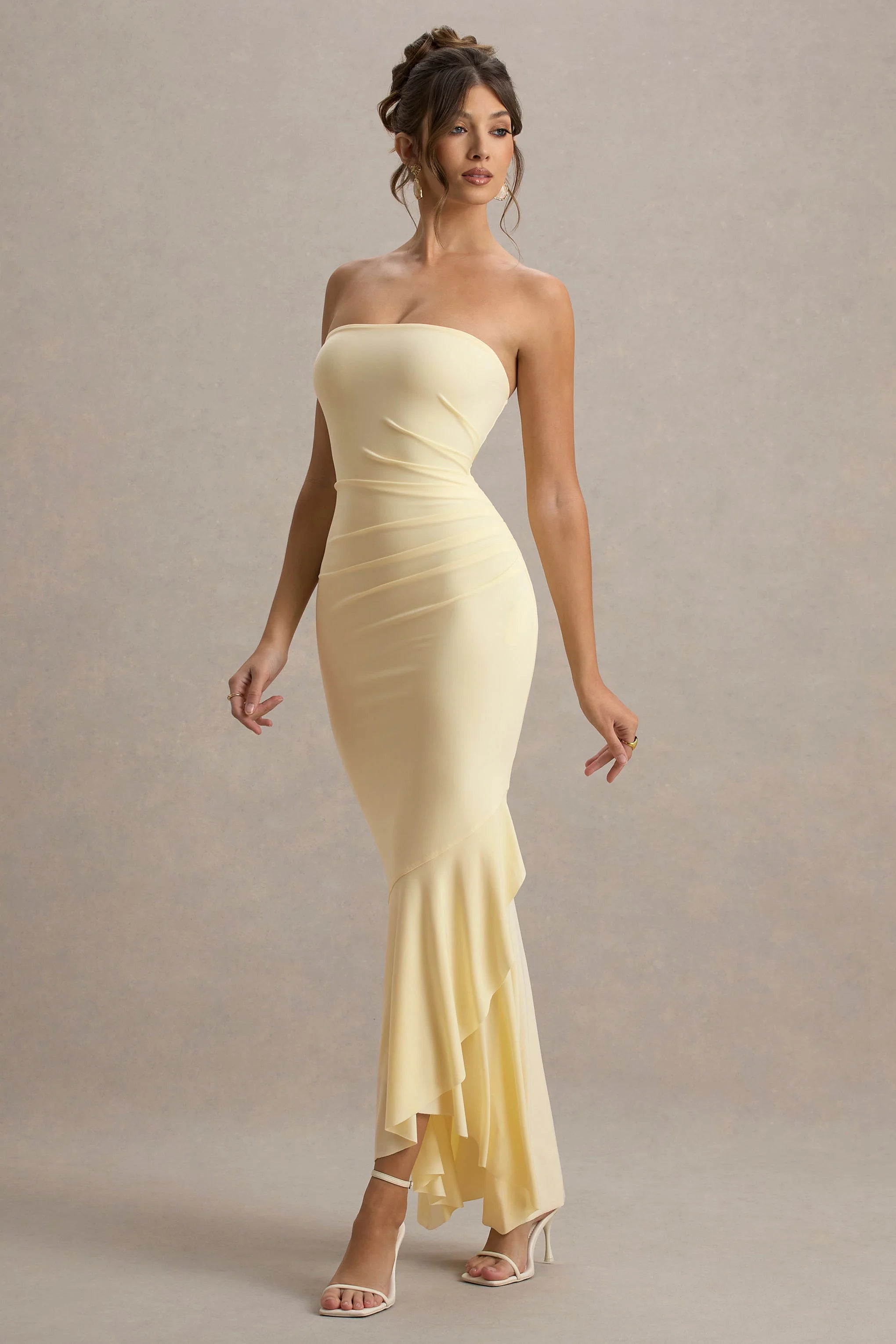 Craving a look as sweet as you? Then meet Capria, our beautiful bandeau maxi yet styled with flouncy frills, romantic ruffles and a sculpting wrap design. Made from premium stretch jersey in a seasonal shade of trending pale lemon, you'll be sure to capture the gaze of everyone, in whatever room you enter.