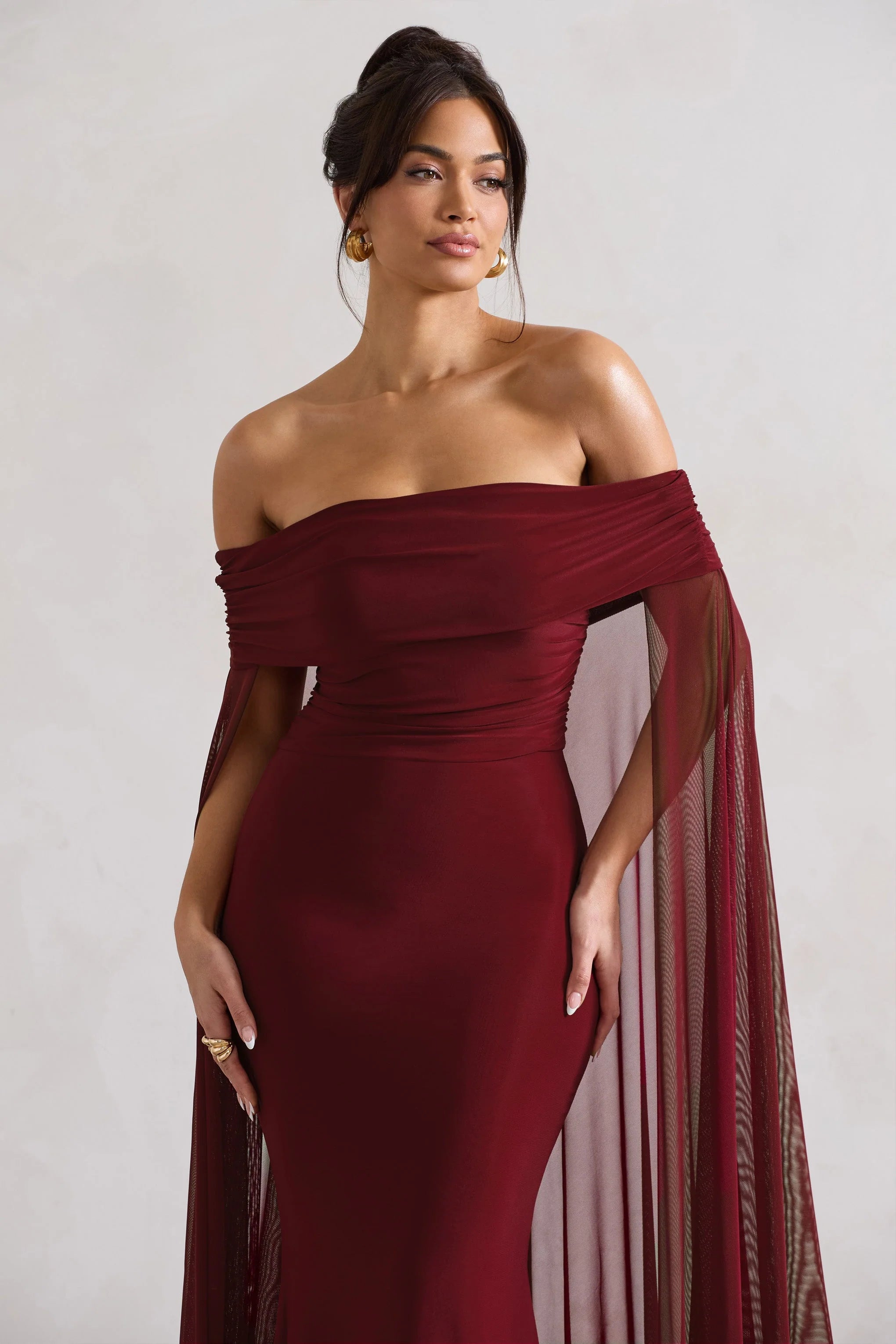 Exude an ethereal state of mind in Carlotta, our captivating cape maxi dress. Defined by a flowing chiffon cape, this berry maxi also boasts a timeless bardot neckline and floor length skirt. For the perfect wedding guest ensemble, style yours with a tousled bun and statement earrings.